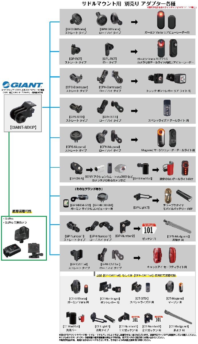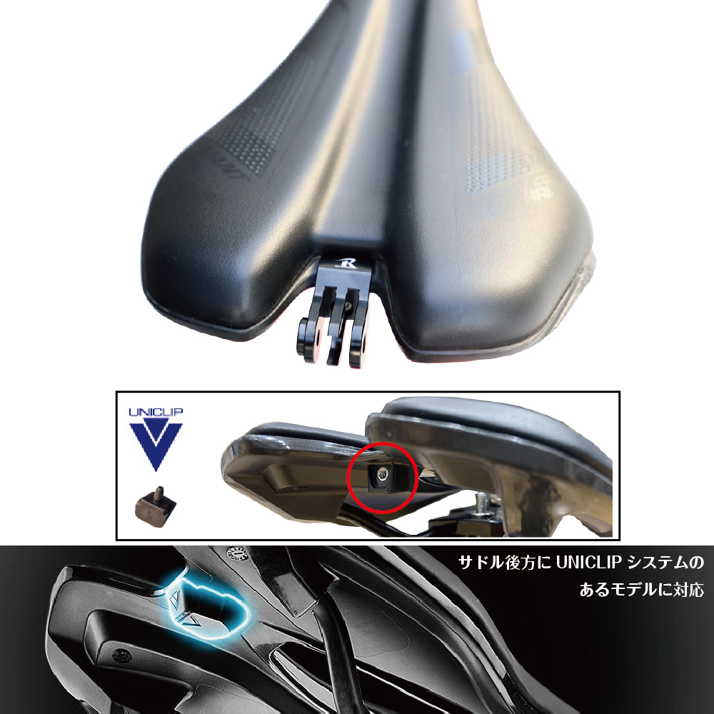 GoPro HEROシリーズのカメラ または ゴープロインターフェイスのある互換性があるカメラや、GPの型番で始まるセーフティライトアダプター・テール系アダプター(泥除け/ゼッケンなど)・カメラアダプター・ライトアダプター・サイクルコンピューターアダプターなどが取付可能