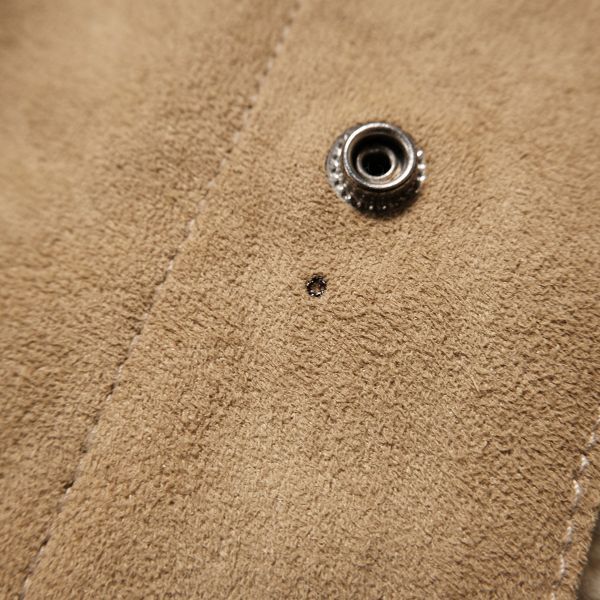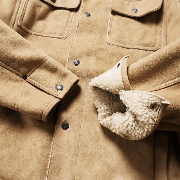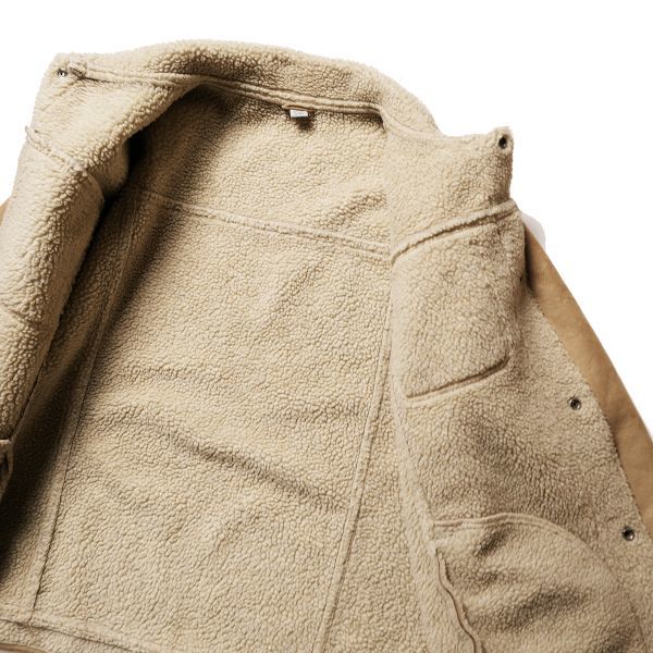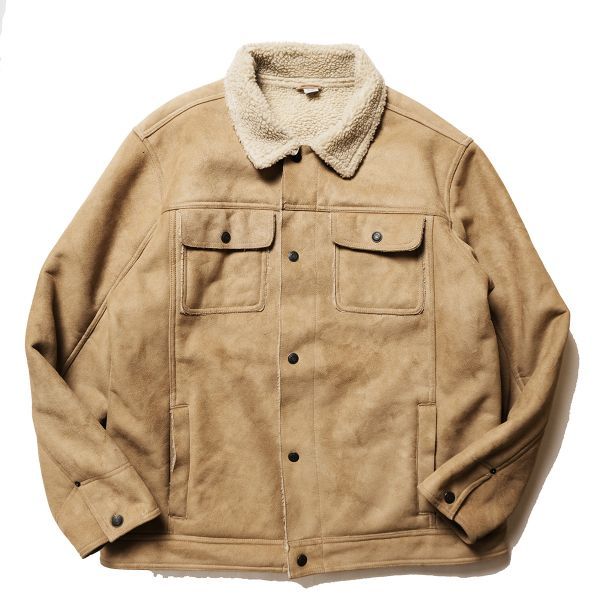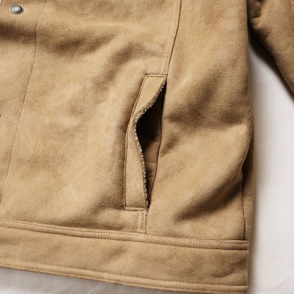 あまり見かけないトラッカースタイルのフェイクムートンジャケット。