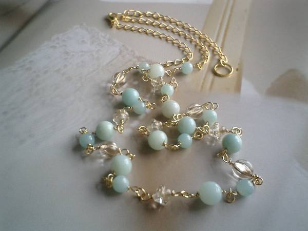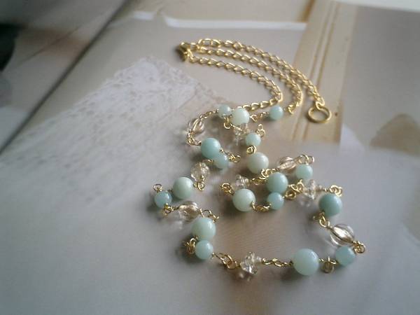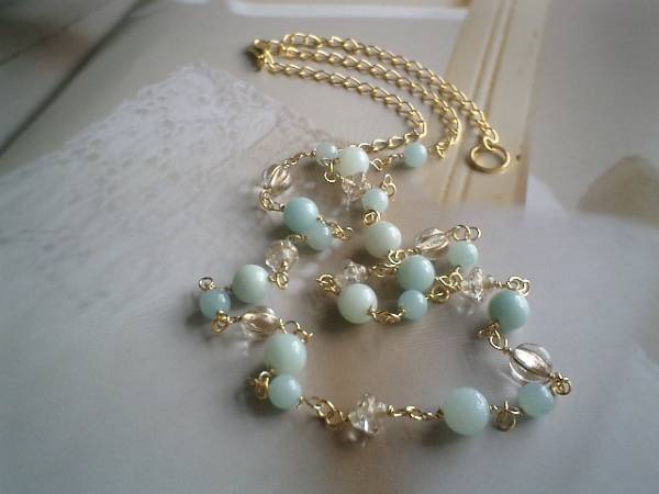 ビター・スィート・・シリーズです♪水色のワンピース・・可憐なアマゾナイトのネックレスです♪6ミリ、8ミリの丸玉のアマゾナイトにデザインチェコビーズを合わせました♪長さは全長77センチ位で調節自由です♪お揃いのネックレスやブレスレットやピアスも出品しています♪シンプルで長く着けていただけるデザインを考えて作りました♪ハンドメイドをご理解頂いてノークレーム、ノーリターンでお願いします