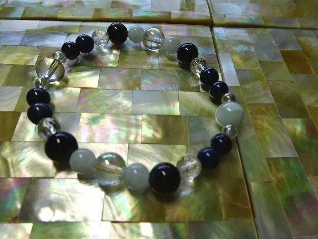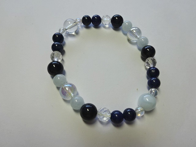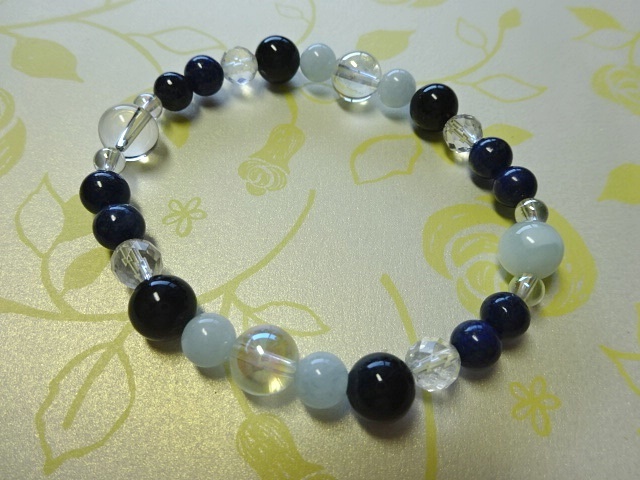 構成:ラリマー8㎜1粒 水晶8㎜1粒 ラピスラズリ6㎜8粒 アクアオーラ4㎜4粒 ブルータイガーアイ8㎜4粒 アクアマリン6㎜4粒