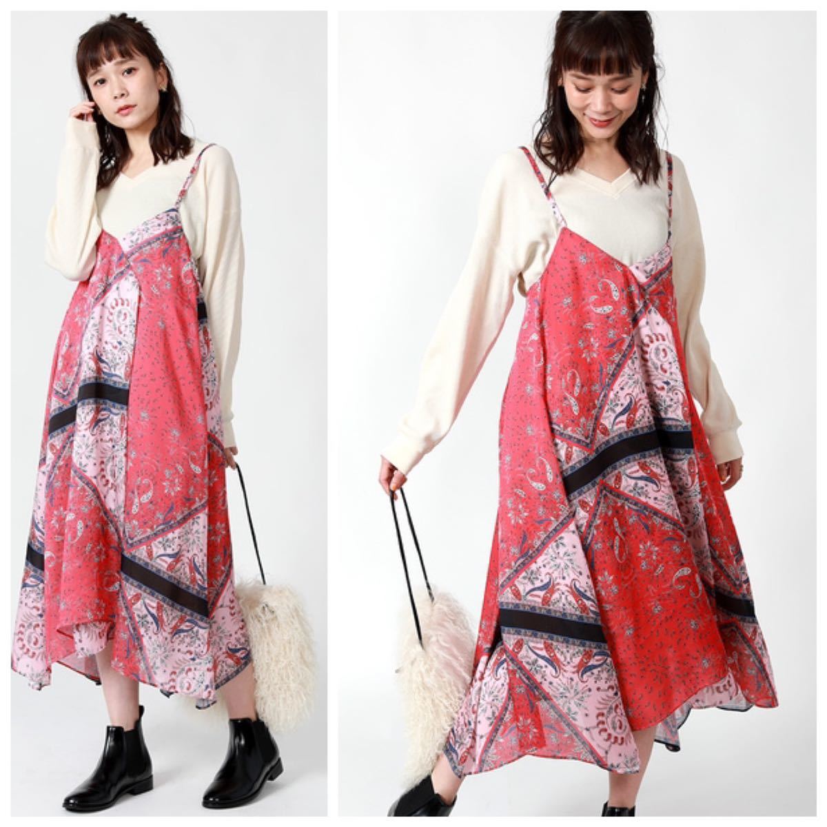 見る角度によって表情を変えるアシンメトリーワンピースアシンメトリーデザインとパッと目を引くスカーフ風の柄が可愛いワンピース。