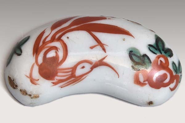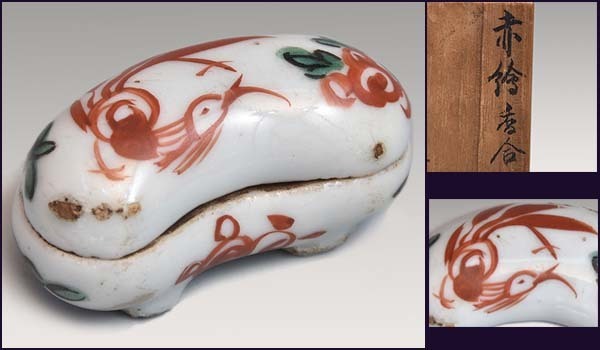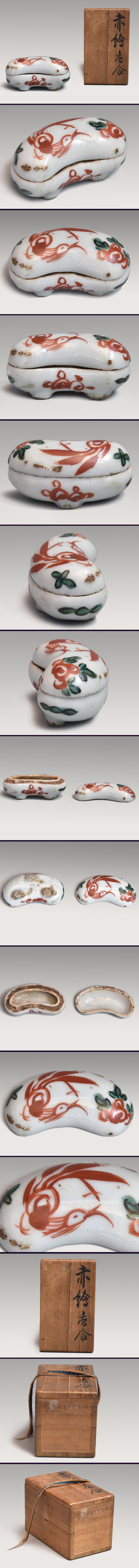 なまこ形の香合で上下に赤絵が施され足が三か所付いた香合です。 キズはございません。 ※撮影の際に生じた写り込みなどがございます。 ご理解の程よろしくお願い致します。 |