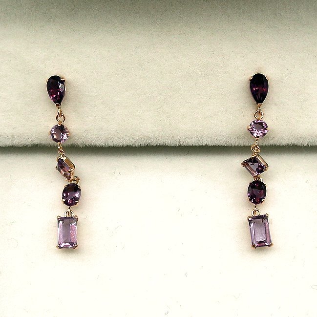 上から順にペアシェイプ-ラウンド-スクエア-オーバル-バゲットと、宝石の主だったカットが詰め込まれたとても楽しいピアスとなっています。