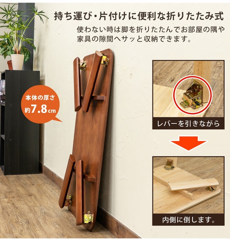 サイズ | (W)幅90cm×(D)奥行き50cm×(H)高さ33cm 天板の厚み:約1.8cm 折りたたみ時の厚み:約7.8cm |