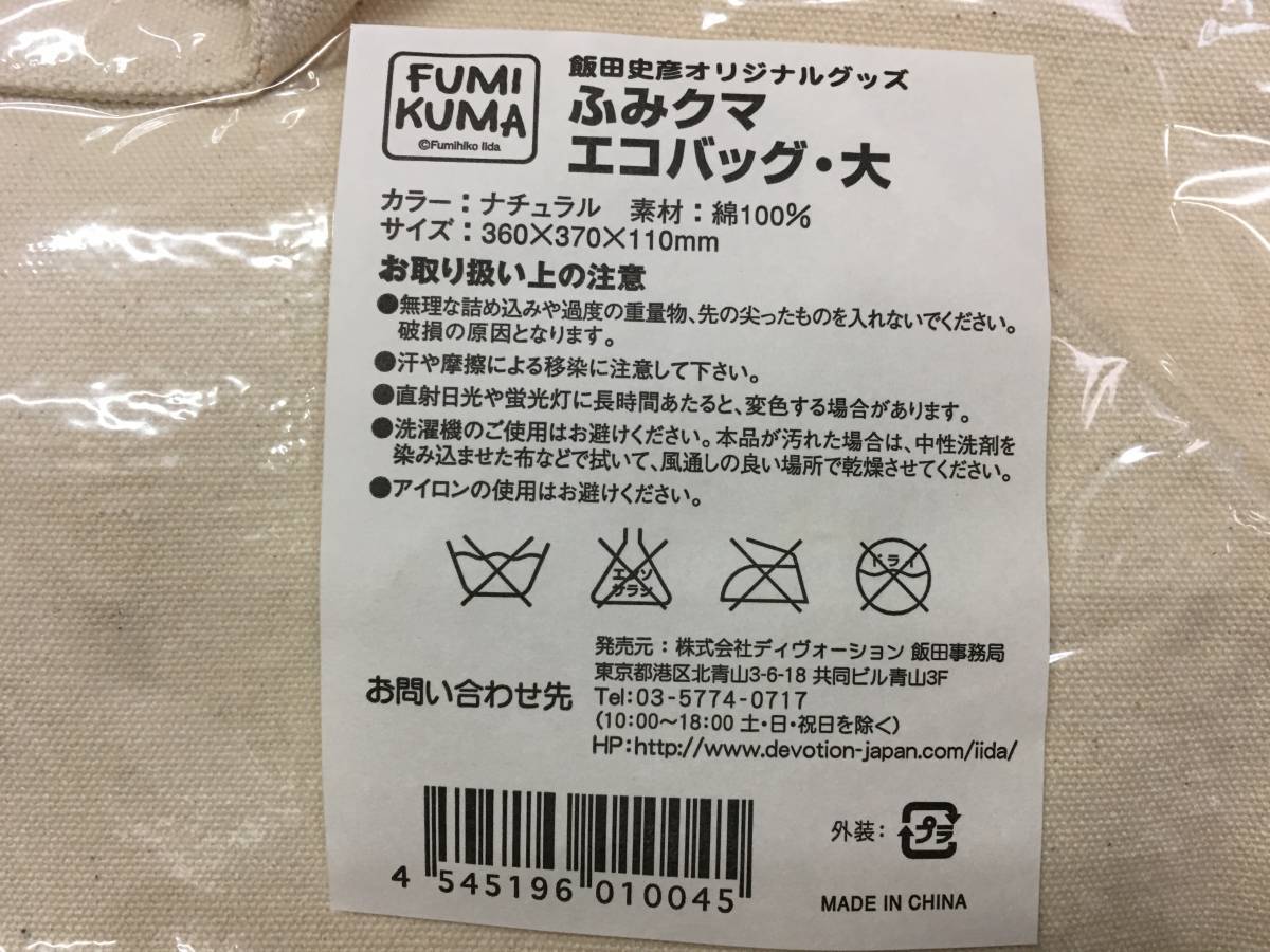 飯田史彦 オリジナルグッズ ふみクマ エコバッグ 大 FUMI KUMA いいだ ふみひこ 綿100 買い物鞄 かばん カバン ECO 珍品 キャンバス地 珍品
