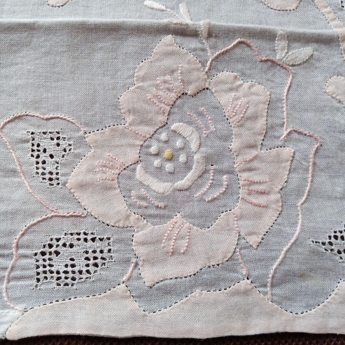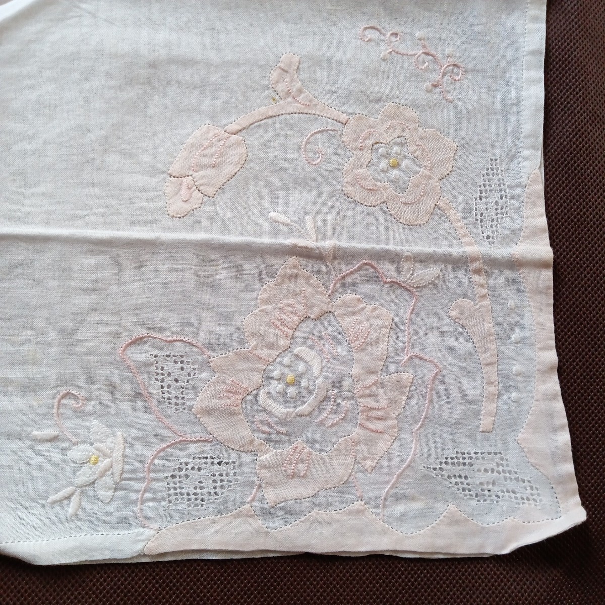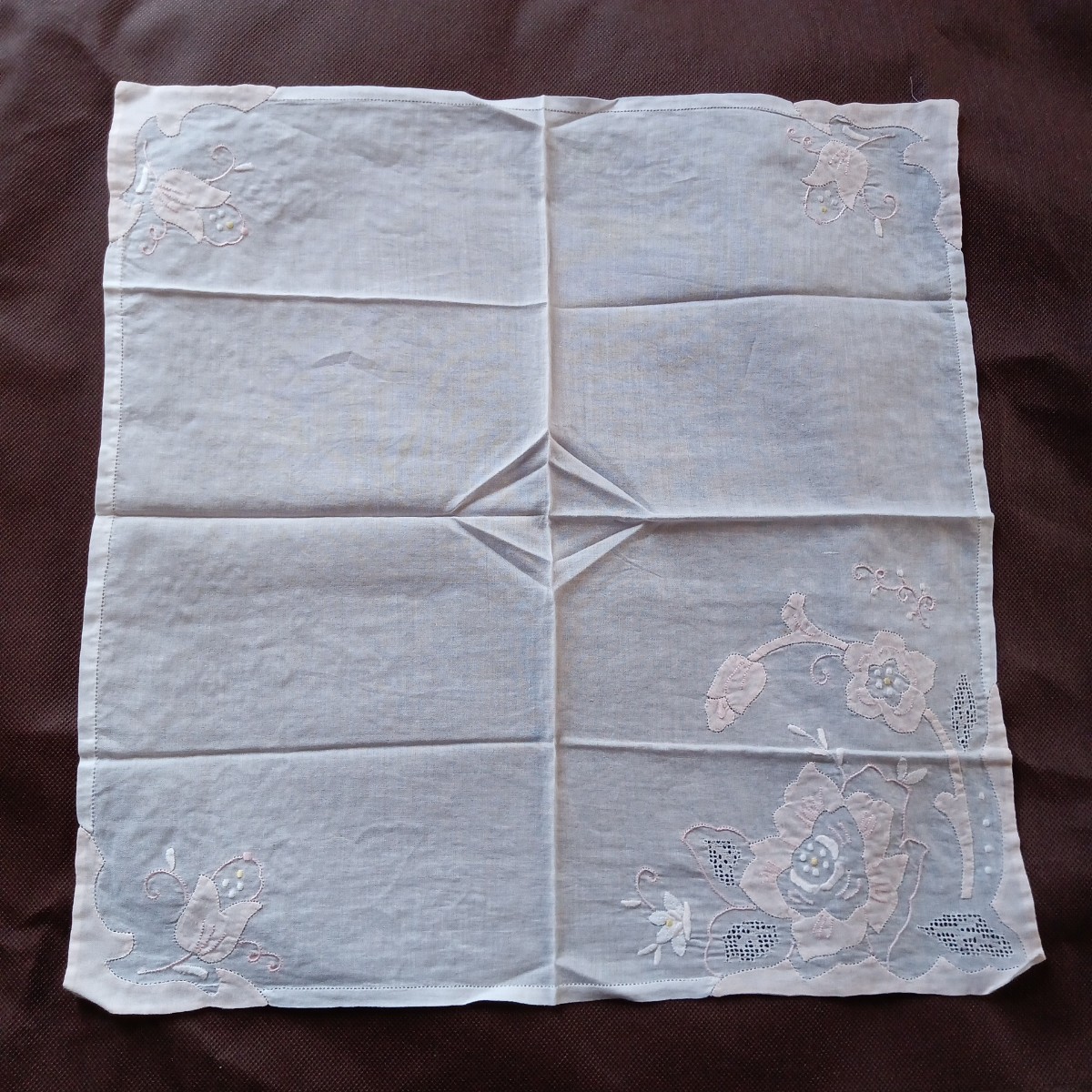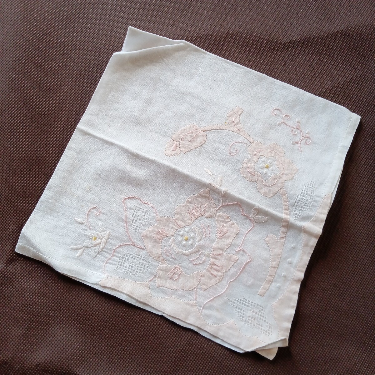 高級スワトウ刺繍の素敵なハンカチーフです。特徴的な繊細で美しい花柄の刺繍が施されています。大変手間の掛かった贅沢な一品です。ホワイト地に、ライトピンクの布を用い、パッチワークで花が表現されています。ほんのり淡い色合いが優しい印象です。ステッチの一つ一つをご覧頂くと、細部まで実に丁寧で細やかな仕事振りがよくお分かり頂けるかと思います。ハンカチとして、ポケットチーフとしておしゃれにご使用頂けます。