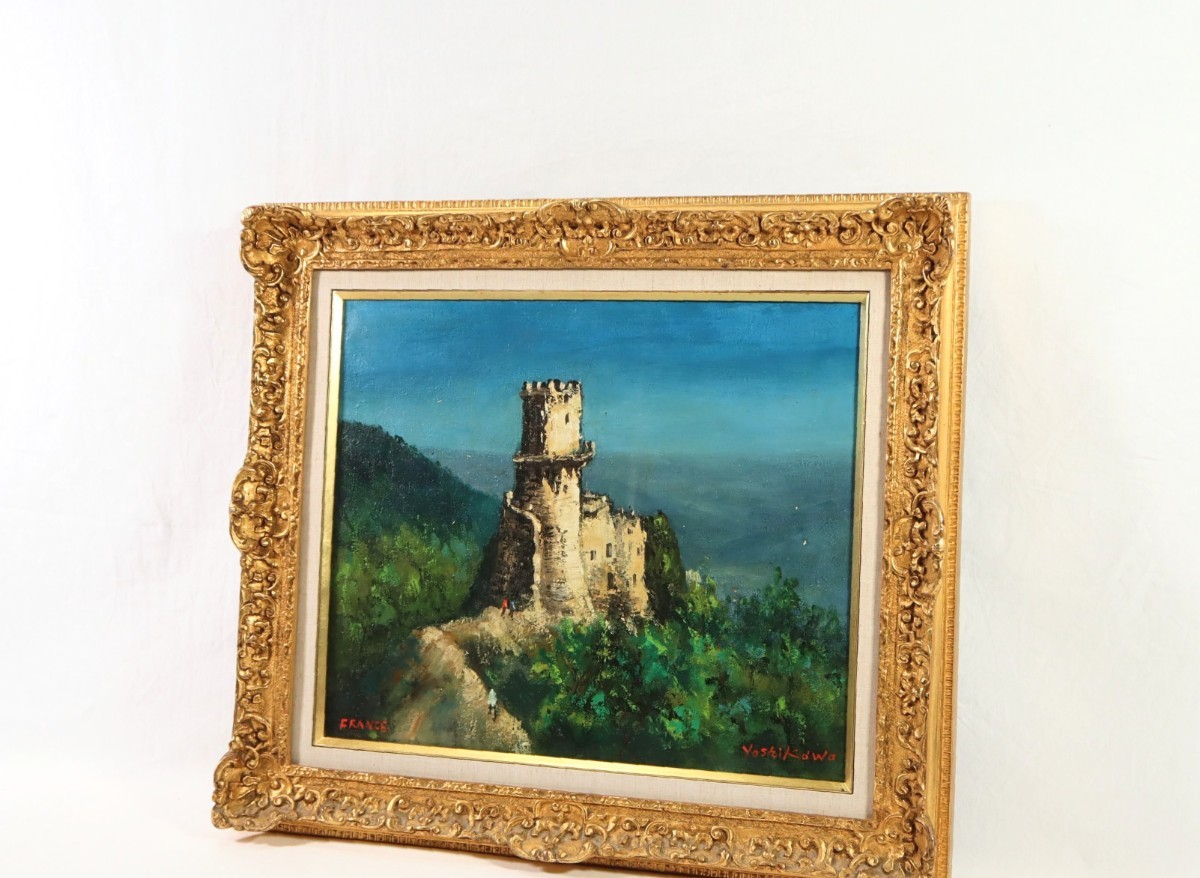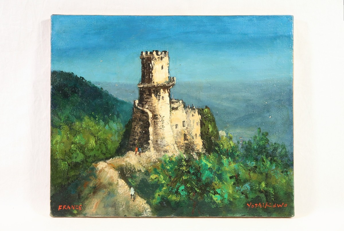 真作 吉川康雄 油彩「シヤト オ グイヨン (フランス)」画寸 F8 大阪府出身 日華美交友委員 平賀亀祐に師事 山の上に建つ白亜の塔 7682