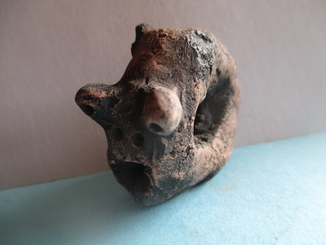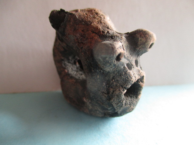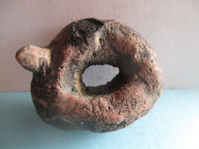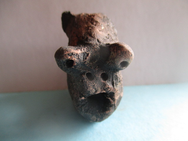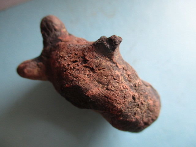 動物にも植物にも見えますが、通常の感覚、正常な意識では思いつかないような造形です。別世界やら異次元やらを想起させます。独特の世界観を持った方が作ったと思われます。とりあえず「精霊の土偶」と命名してみました。青森県屈指の土偶コレクターからあずかりました。2代前のご先祖が明治三十年代に県内の遺跡から発掘したとのことです。供物といっしょに祭壇に飾るなど祭祀的な意味があるそうです。全高約4.8cm。土中から掘り出したものですので鑑賞を妨げない程度のヒビやカケ、擦れ、表面の剥離があります。水につけると、ほんの少し土臭がします。金色に輝く微小な鉱物が少し含まれていますが、砂金ではなく、雲母であると思われます。これまで一度も鑑定に出したことがなく、正真正銘の真贋不明ですが、トラブル防止のためあえてレプリカとして出品させていただきます。高騰防止のため即決価格をご用意しました。 自己紹介欄にオークション休業日を記載させていただいております。お手数とは存じますが、ご入札前にお読みいただければ幸いです。よろしくお願い申し上げます。
