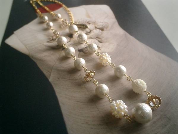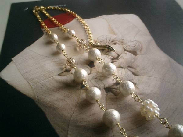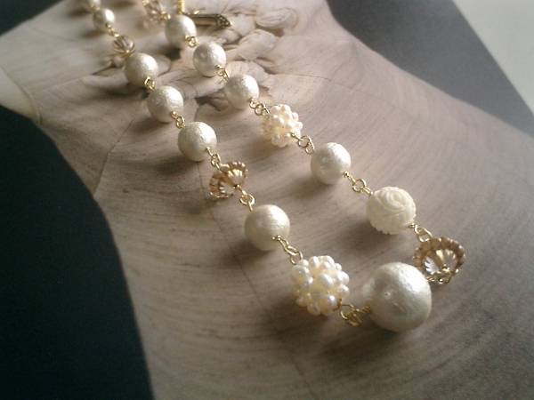 ロマンチック・セレクト・・シリーズです♪オフホワイトのコットン・パールのネックレスです♪薔薇のボーンや淡水パールボールやチェコビーズやデザイン樹脂を合わせて華やかな表情です♪コットンパールは8ミリから16ミリ位までの丸玉です♪薔薇のボーンは12ミリ、淡水パールボールは12ミリ、14ミリ位です♪長さは全長60センチ位で調節自由です♪チョーカー風にされても素敵です♪お揃いのブレスレットも出品しています♪シンプルで飽きのこないいつまでも着けられるデザインを考えて作りました!ハンドメイドをご理解頂いてノークレーム、ノーリターンでお願いします
