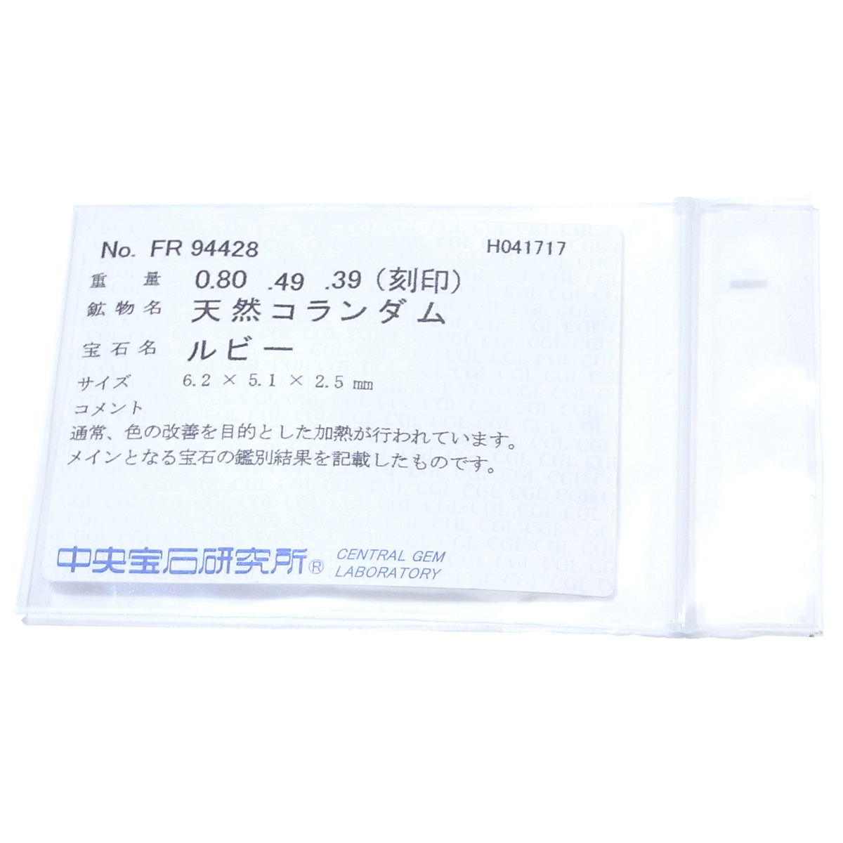 | 品名 | 0.80ct ルビー 0.49ct 0.39ct ダイヤモンド リング・指輪 Pt900プラチナ 16号 レッド |