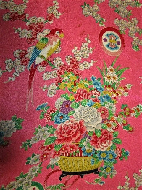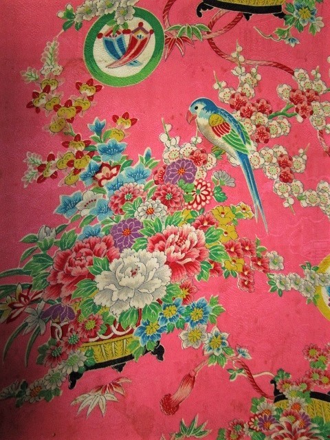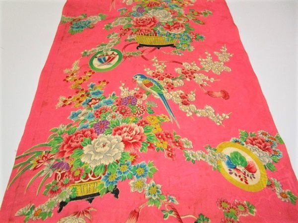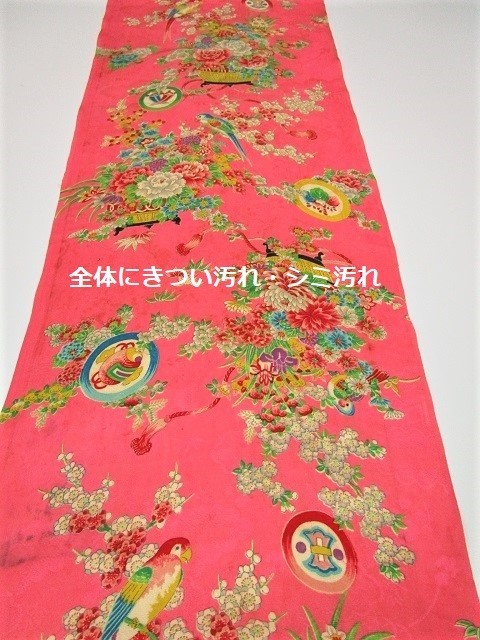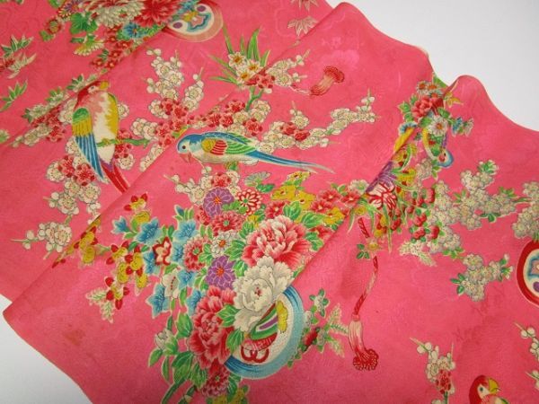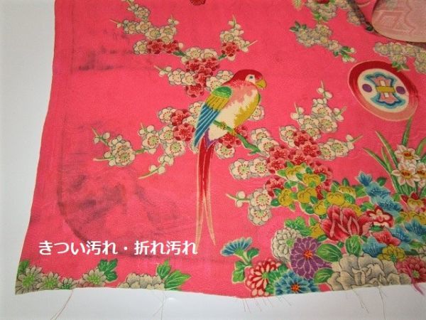 D-46★ピンク地*鶯*鳥色々*菖蒲*牡丹*菊*綸子*古布はぎれ★汚れあり!文化人形/一閑張り/吊るし雛/市松人形