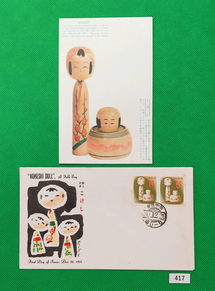 FDC/ア/年賀切手/こけし/2枚貼り/昭和31年用/ポストカード付/初日印/東京中央普通印/解説書無し/1955年12月20日/初日カバー №417