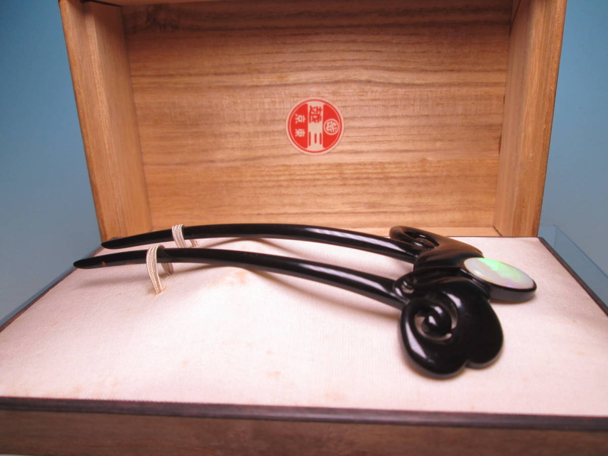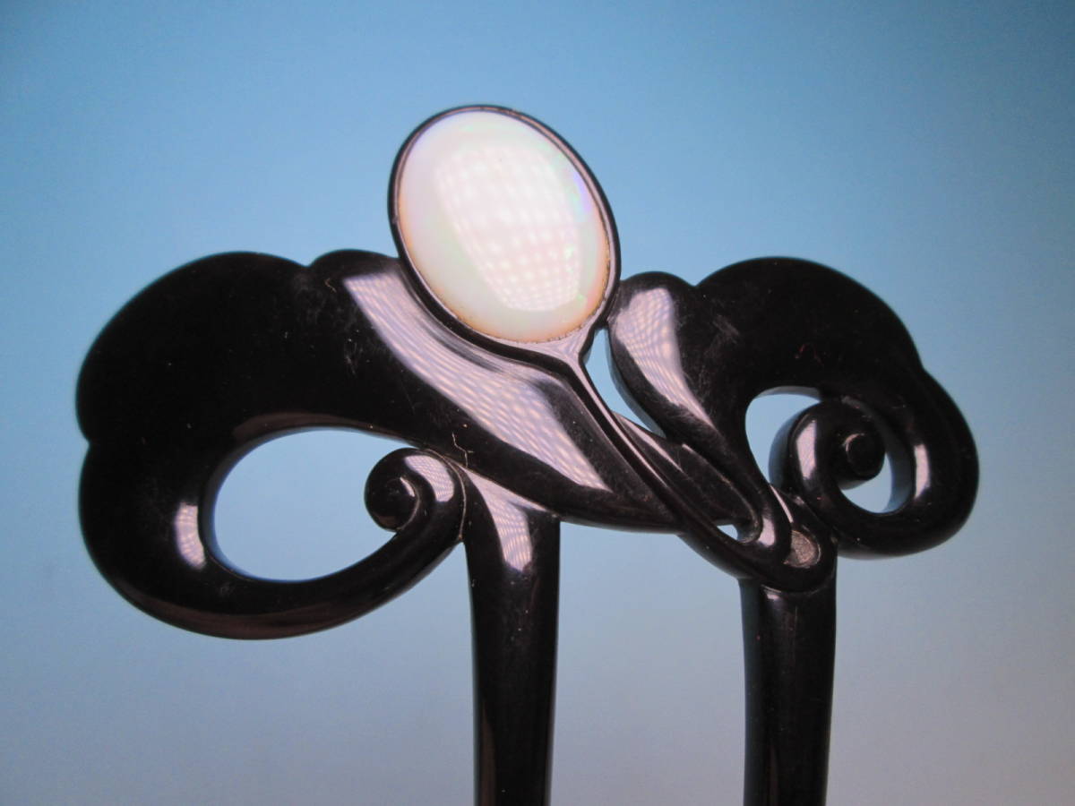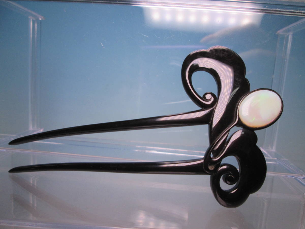 【江月】アンティーク・三越 本鼈甲 黒甲 オパール飾りのかんざし 木箱付き