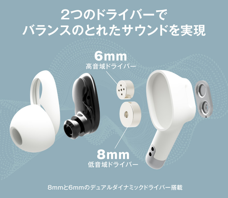 8mm/6mmデュアルダイナミックドライバー搭載、バランスのとれた高音質を実現