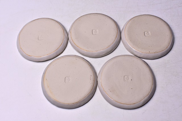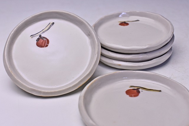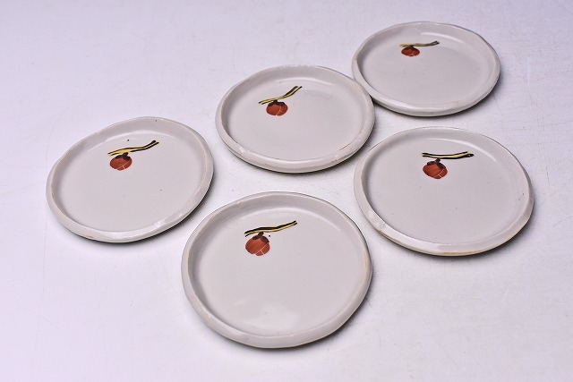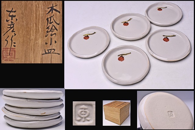 伊藤東彦 ★ 木瓜絵 小皿 5客 ★ 共箱 ★ 師: 人間国宝 松井康成 ★ 愛らしい絵付の逸品 ★ 食器 菓子皿 ★ 笠間焼