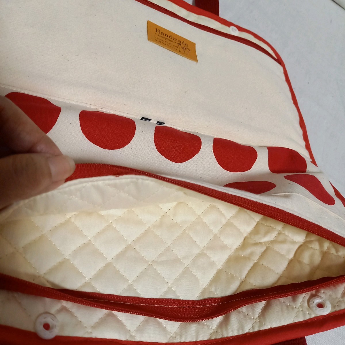 ポーチを留めるのはスナップボタンで、持ち手ベルト付きで、お手持ちのショルダーベルトを取り付けてショルダーバッグにして頂けるようにDカンも付けました。