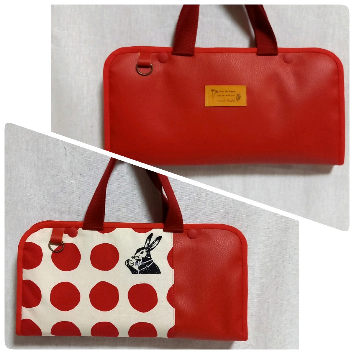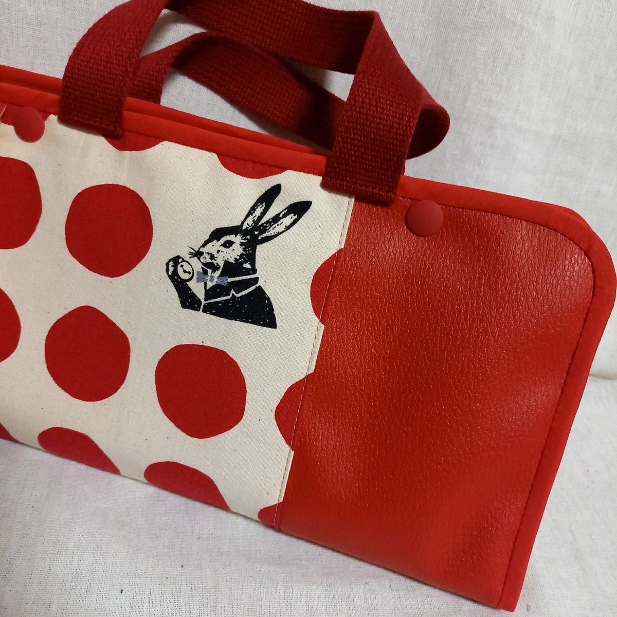 もう片側はレトロうさぎの生地と赤の合皮を切り替えたデザインです。