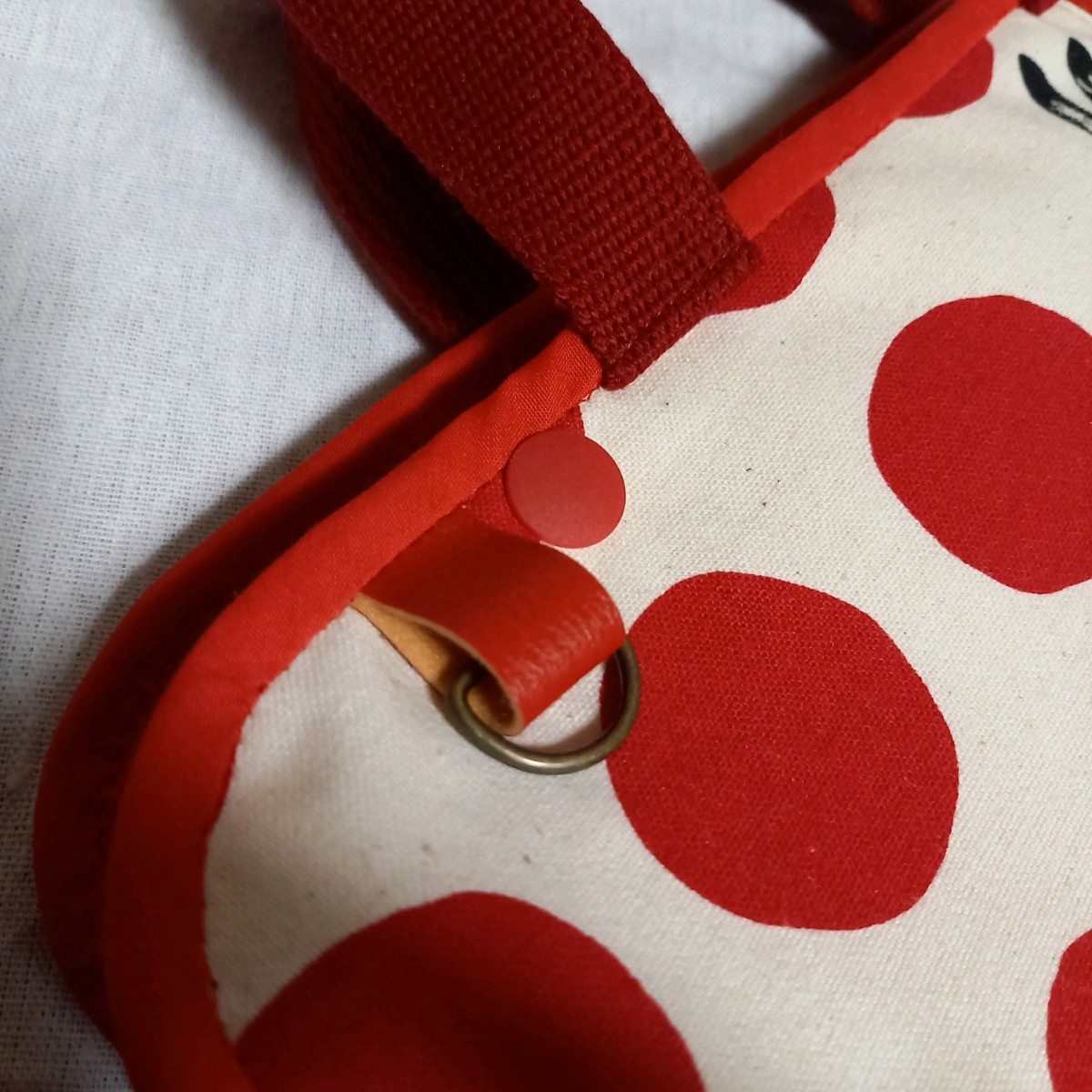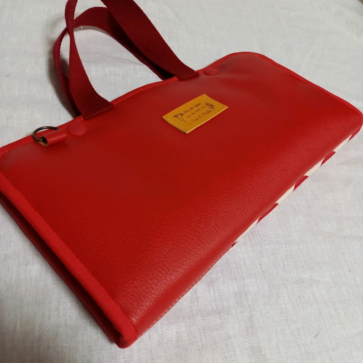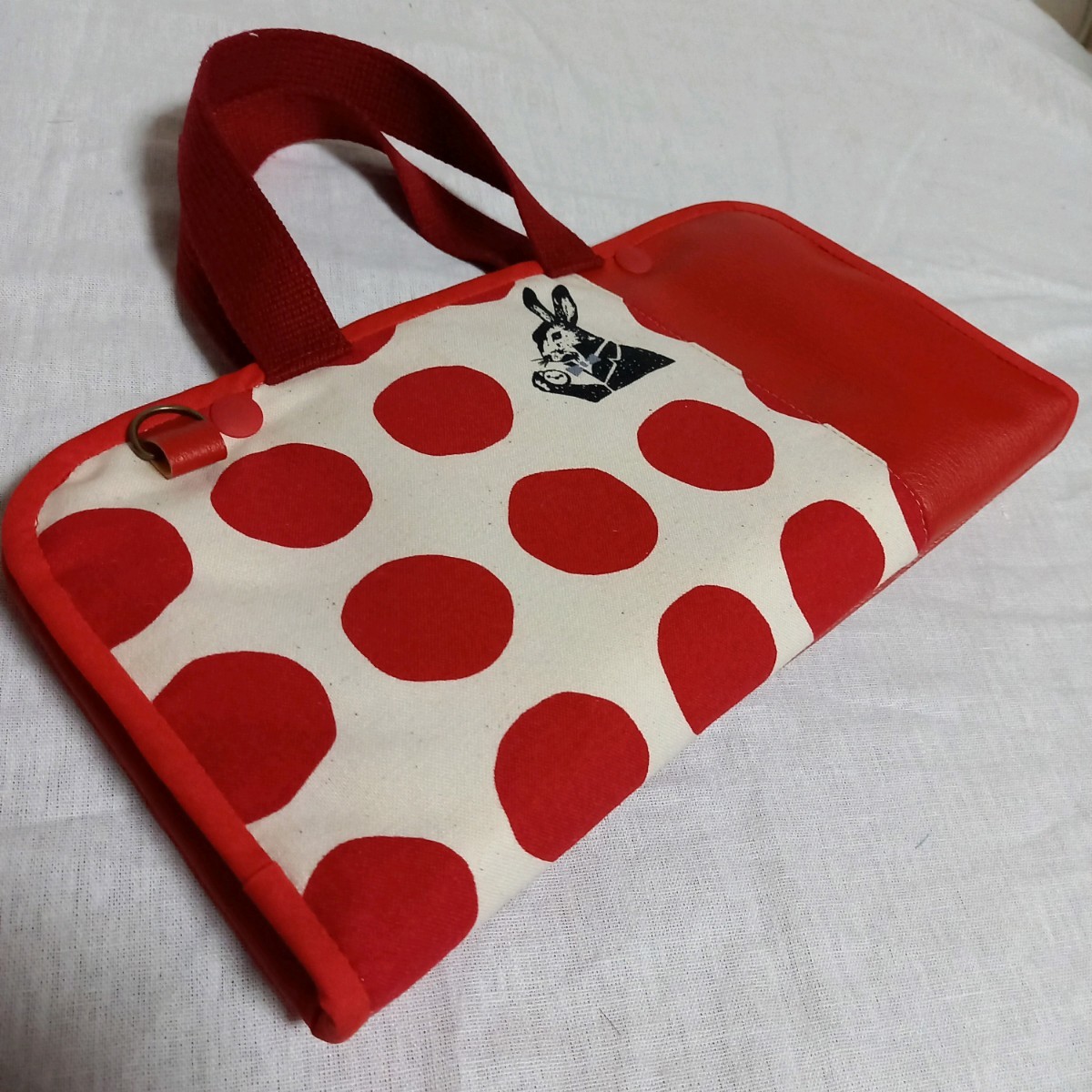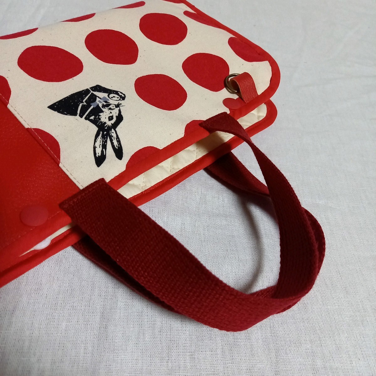 赤い大きなマルと黒のうさぎがレトロで可愛い生地と赤の合皮を合わせました。