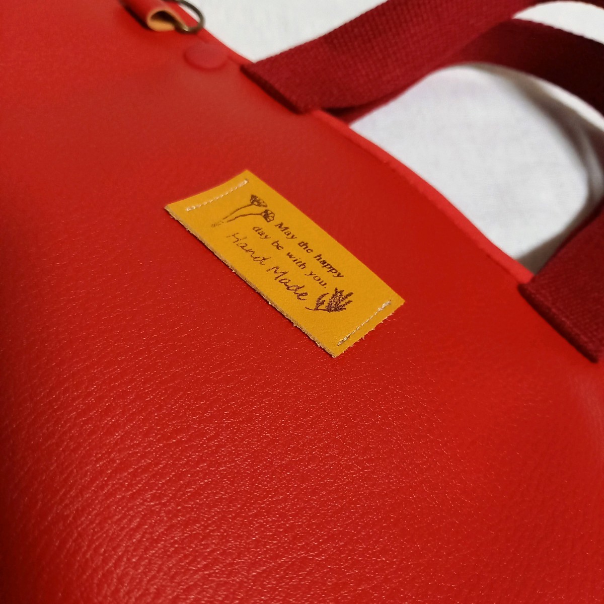 片側は赤の合皮に本革のタグを縫い付けたシンプルなデザイン、