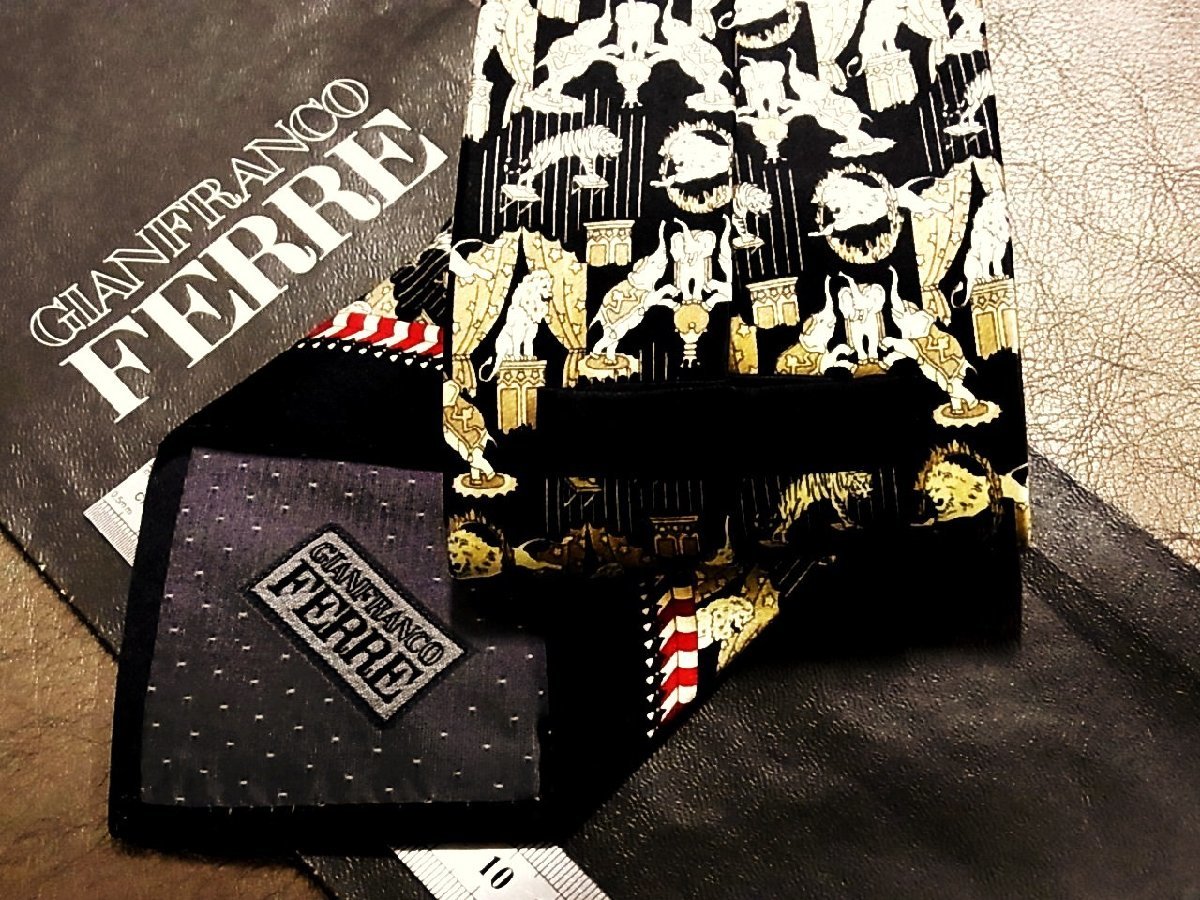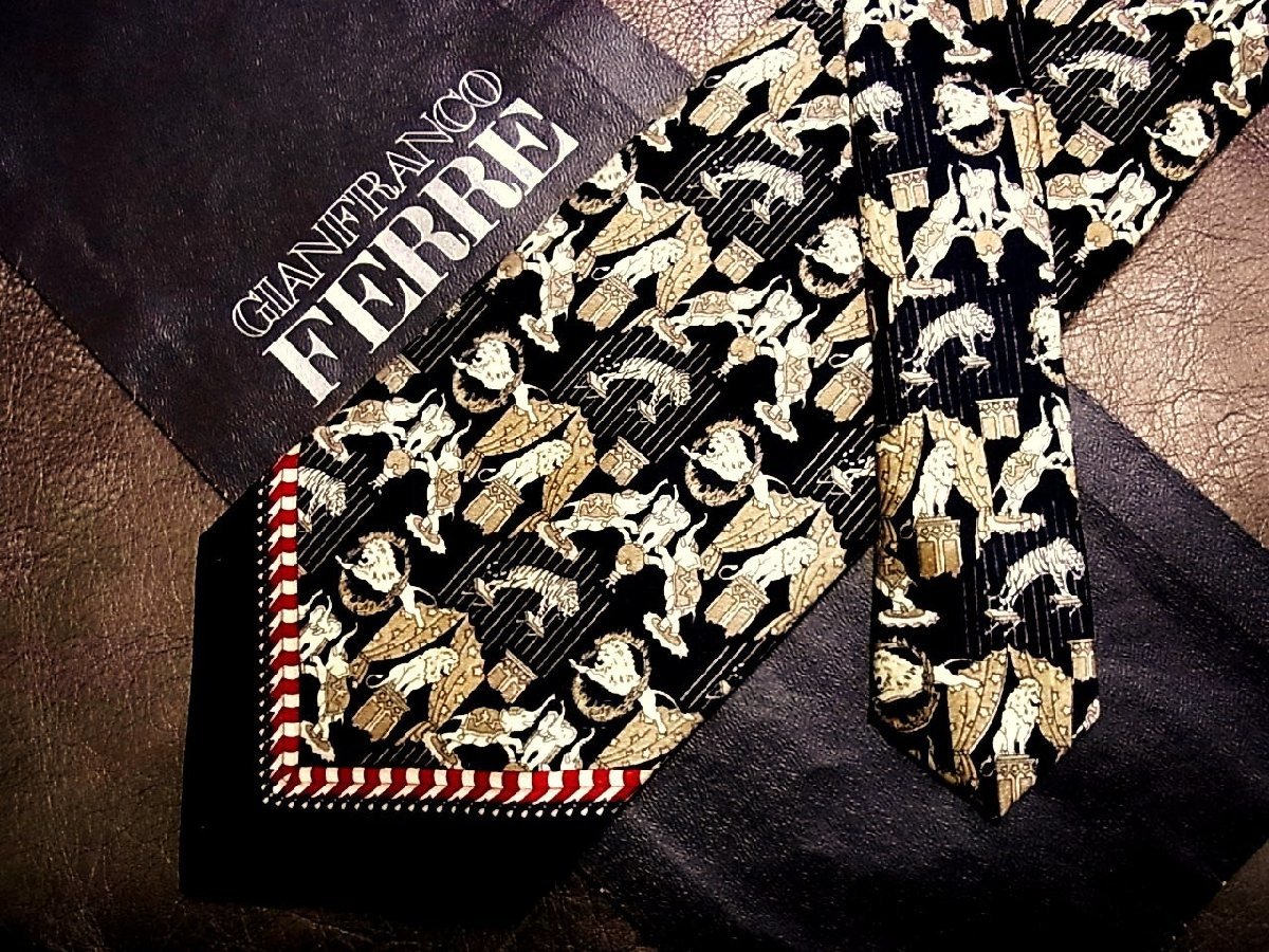 ★並品★4R01105【FERRE】ジャンフランコフェレ「ライオン 象 ゾウ 火の輪 サーカス 柄」ネクタイ