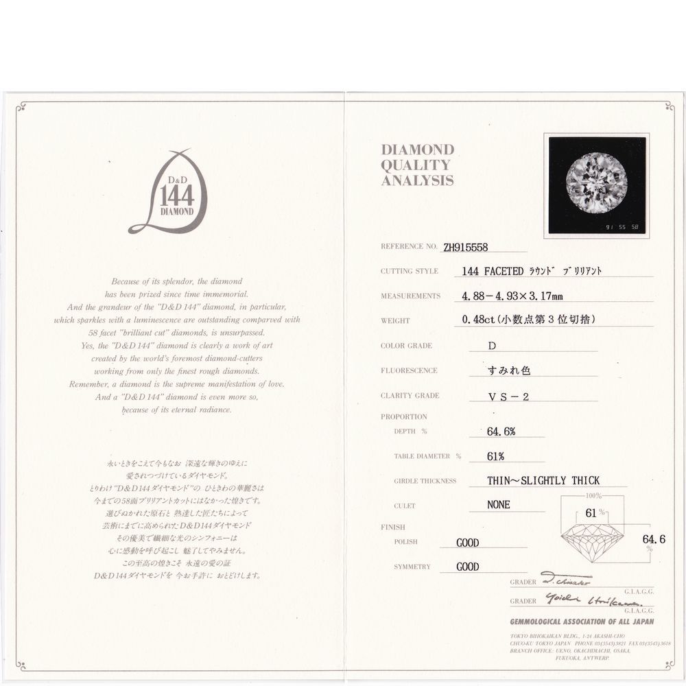 センターのダイヤモンドのガードルには、D-D144のレーザー刻印がございます。顕微鏡でしか見えません。