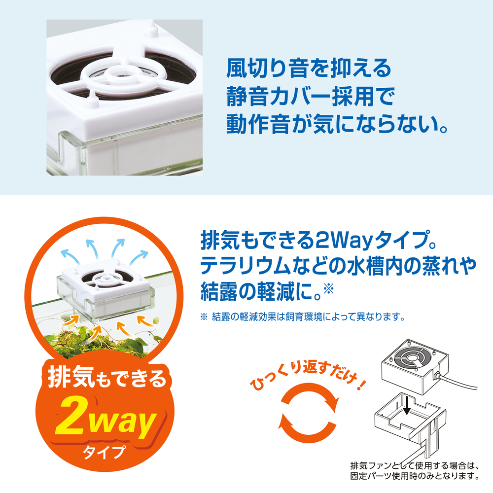 ●排気もできる2Wayタイプ。テラリウムなどの水槽内の蒸れや結露の軽減に。