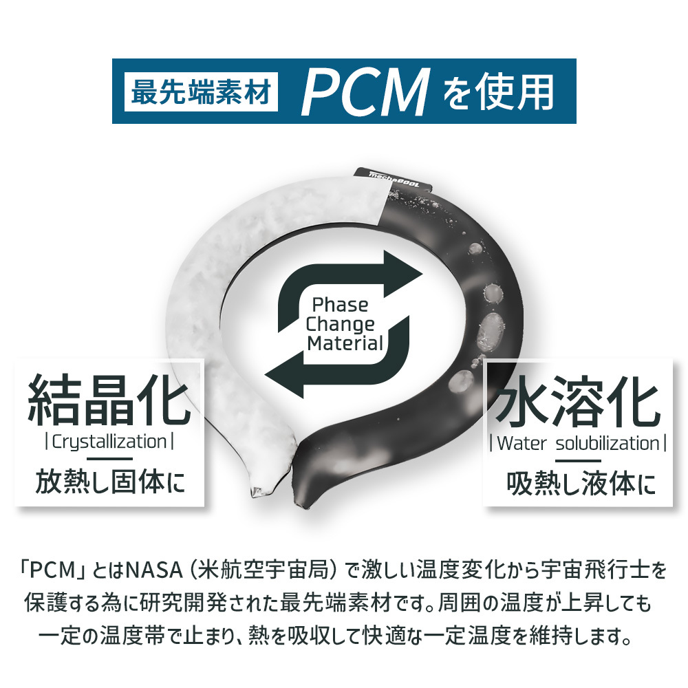 ■表面:TPU(熱可塑性ポリウレタン) 耐久性が高く軽量で持ち運びがしやすい素材です。プラスチック素材ではありますが、一般的なイメージである硬さはなく柔軟性を持ち合わせています。大腸菌に99.9%、黄色ブドウ球菌に99.5%の抗菌効果があります。 ■内部:PCM(Phase Change Material) PCMとは米航空宇宙局NASAで急激な温度変化による宇宙船の動体亀裂を防止し、激しい温度変化から宇宙飛行士を保護するために研究開発された技術です。一般的な物資は周囲の温度が上昇すると共に上昇しますが、PCMは周囲の温度が上昇しても一定の温度帯で止まり熱を吸収して一定温度を維持します。これがひんやりをキープできる秘密です。 |