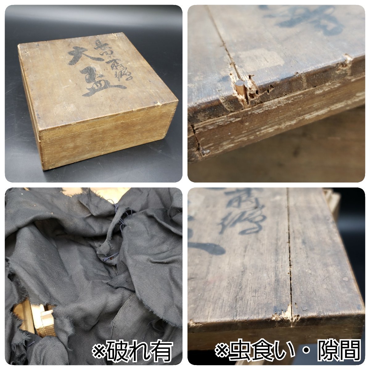 古い七福神の漆器です。木箱付きです。漆器は汚れ、擦れ、欠けがあります。木箱は汚れ、擦れ、ヒビ、虫食いなどがあり状態は良くないです。漆器を覆っている布も破れが多いです。