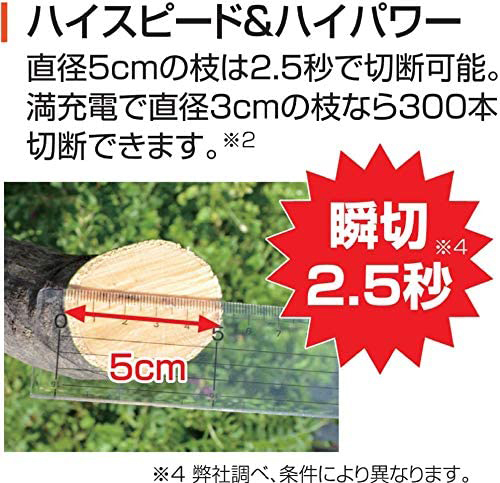 ・直径5cmの枝を2.5秒で切断可能です。満充電で直径3cmの枝なら約300本切断できます(弊社調べ)。