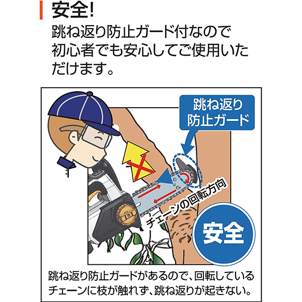 ・危険なキックバックを防ぐ跳ね返り防止ガード付なので、初心者でも安全に安心してご使用いただけます。