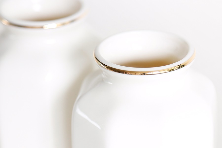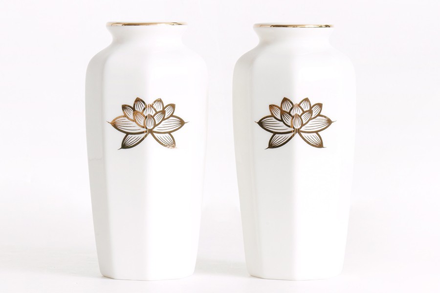 美濃焼 磁器(ニューボン)製の金蓮入り八角花瓶です。 程よい大きさの高さ15cm。2本組セットとなります。 | ||||