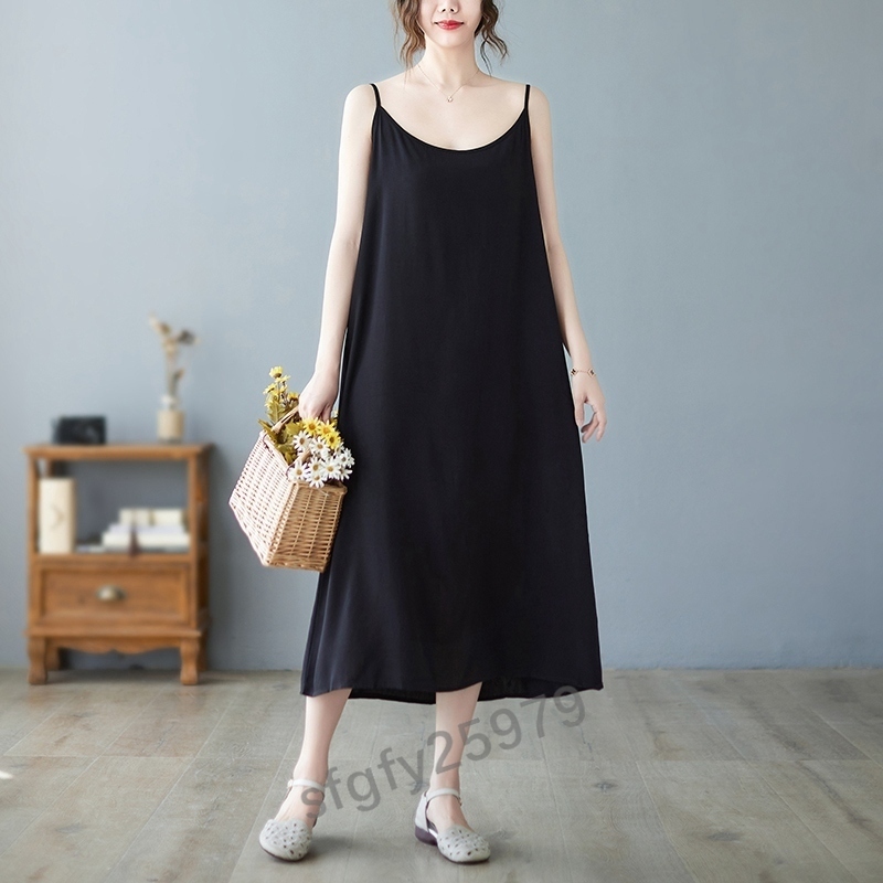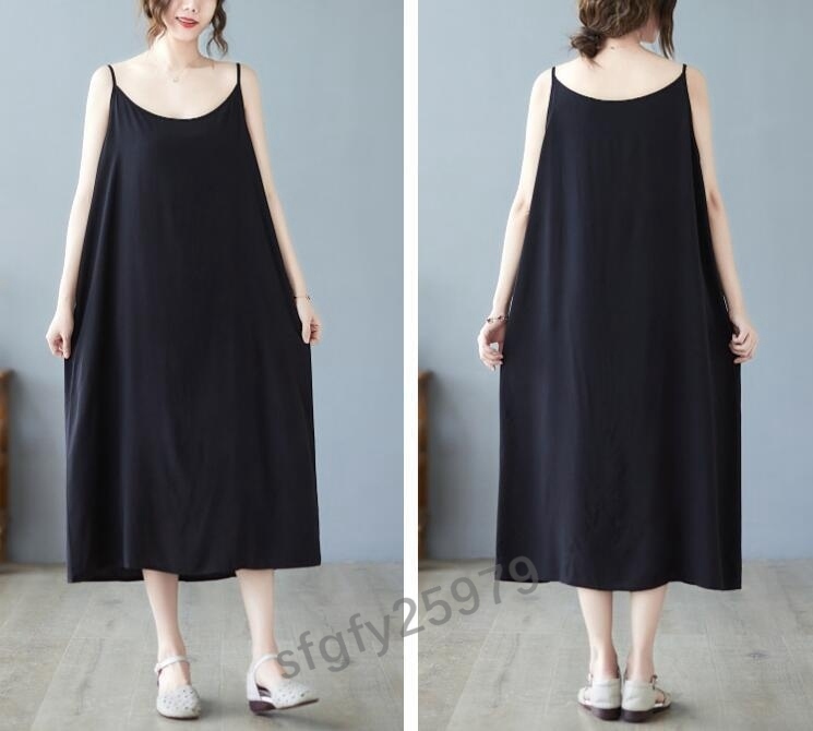 H183☆新品春夏 レディース カジュアル ゆったり大きいサイズ体型カバー 無地 半袖マキシロングワンピース 黒