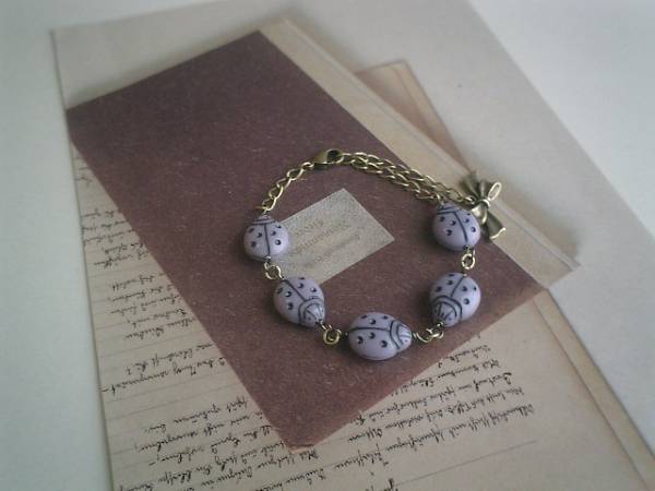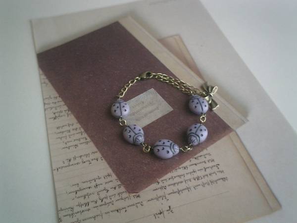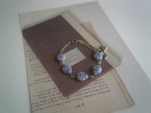 イノセント・ガール・・シリーズです♪ラベンダー色の幸せ・・キュートなチェコのてんとう虫さんのブレスレットです♪シックなラベンダー色が大人のロマンチックしています♪てんとう虫さんは12ミリ×15ミリ位です♪長さは全長23センチ位で調節自由です♪お揃いのネックレスやピアスも出品しています♪シンプルで飽きのこないいつまでも着けられるデザインを考えて作りました!ハンドメイドをご理解頂いてノークレーム、ノーリターンでお願いします