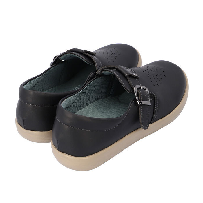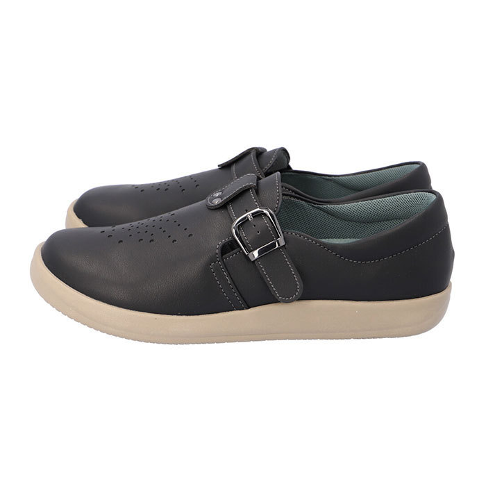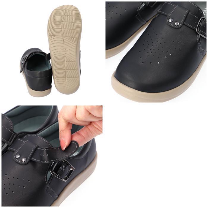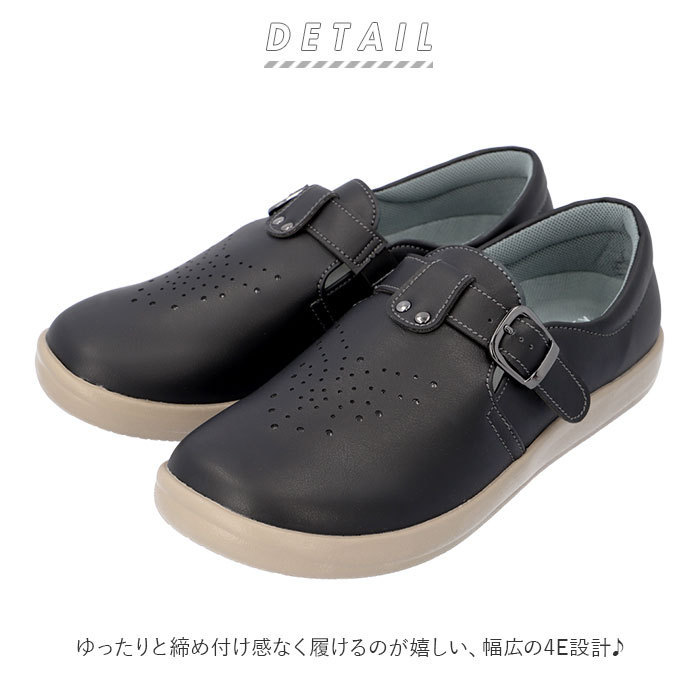 ・ゆったりと締め付け感なく履けるのが嬉しい、幅広の4E設計♪甲部分のベルトで、お好みのフィット感に調節可能。