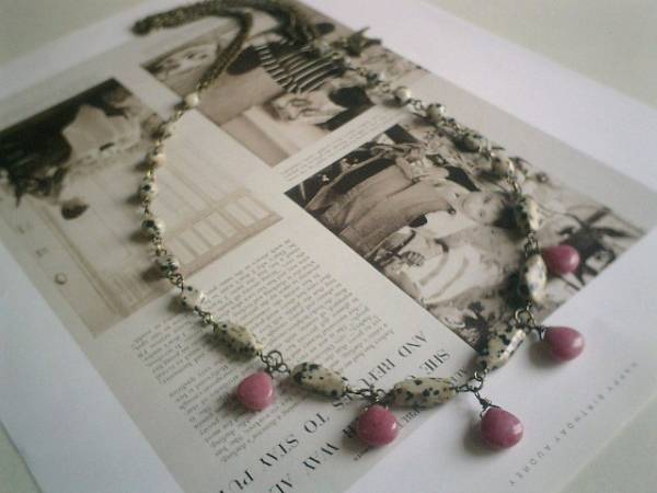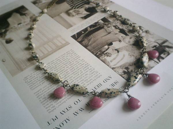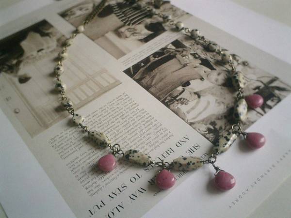 イノセント・ガール・・シリーズです♪パリの美術館・・シックなダルメシアンとシリシャスシフトのネックレスです♪個性的なダルメシアンジャスパーに暗めのピンクが大人っぽいシリシャスシフトのマロンを合わせてキュートな表情です♪ダルメシアンは15×6ミリ位のチューブ、7ミリ位のラフタンブルです♪マロンは10ミリ位です♪長さは全長75センチ位で調節自由です♪お揃いのブレスレットも出品しています。ハンドメイドをご理解頂いてノークレーム、ノーリターンでお願いします