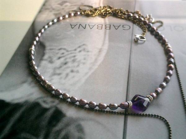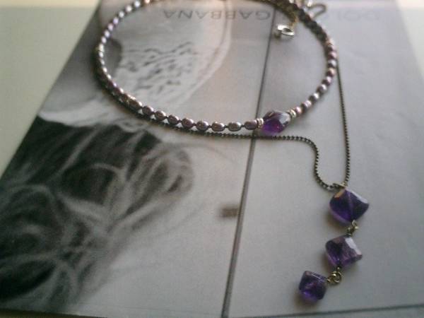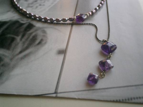 ルーズ・シルエット・・シリーズです♪深い紫色に恋して・神秘的なアメジストのネックレス2本セットです♪重ねても単品でも楽しんでいただけます♪♪10ミリ、13ミリ、15ミリの大きさ違いのダイヤカットのアメジストは繊細なボールチェーンを合わせてキュートモダンしています♪長さは70センチ+アジャスター13センチで最長83センチ位です♪15ミリのアメジストはパープルグレーの淡水パールを合わせました♪デザインチェーンやジルコニアのロンデムを添えて大人のロマンチックしています♪長さは全長57センチ位で調節自由です♪チョーカー風にされても素敵です♪♪お揃いのブレスレットやピアスも出品しています♪ハンドメイドをご理解いただいてノークレーム・ノーリターンでお願いします♪