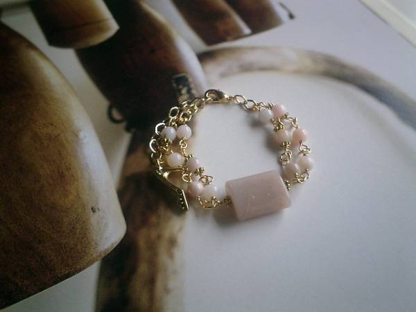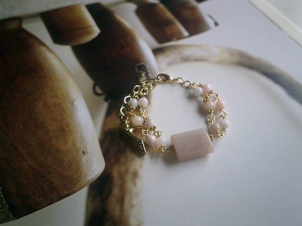 素敵・マニア・・シリーズです♪やさしいピンク・・2連のピンクオパールとオレンジムーンストーンの可憐なブレスレットです♪ナチュラルピンクのオパールは6ミリの丸玉です♪繊細な座金でおめかししてデザインチェーンを合わせました♪トップのオレンジムーンストーンは20×15ミリ位です♪長さは全長23センチ位で調節自由です♪お揃いのネックレスやピアスも出品しています♪シンプルで飽きのこないいつまでも着けられるデザインを考えて作りました♪ハンドメイドをご理解頂いてノークレーム、ノーリターンでお願いします |