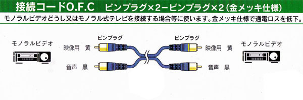 ビデオ接続コード ピンプラグ×2-ピンプラグ×2 2m【 特 長 】● モノラルビデオどうし、又はモノラル式テレビを接続する場合等に使います。● 高伝導率金メッキ仕様で通電ロスを低下● 高純度99.996% O.F.C.線使用【 仕 様 】■ ピンプラグ×2 ? ピンプラグ×2■ コード長:2mこちらの商品は新品未使用ですが、倉庫保管品の為、中古品扱いとしています。パッケージに擦れや傷、破れなどがある場合があります。ご了承ください。 完璧をお求めの方はご購入をお控えください。長期倉庫保管品の為ご了承の上でご購入お願いします。また、万が一、在庫がない場合はキャンセルしていただくことがありますが予めご了承ください。*未開封の為動作確認等はしていません。ご了承の上でご購入お願いします。*ノークレーム・ノーリターンでお願いします。