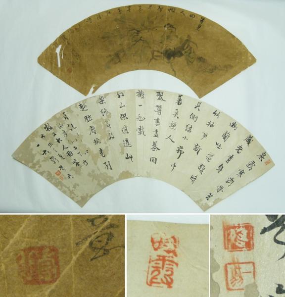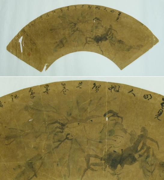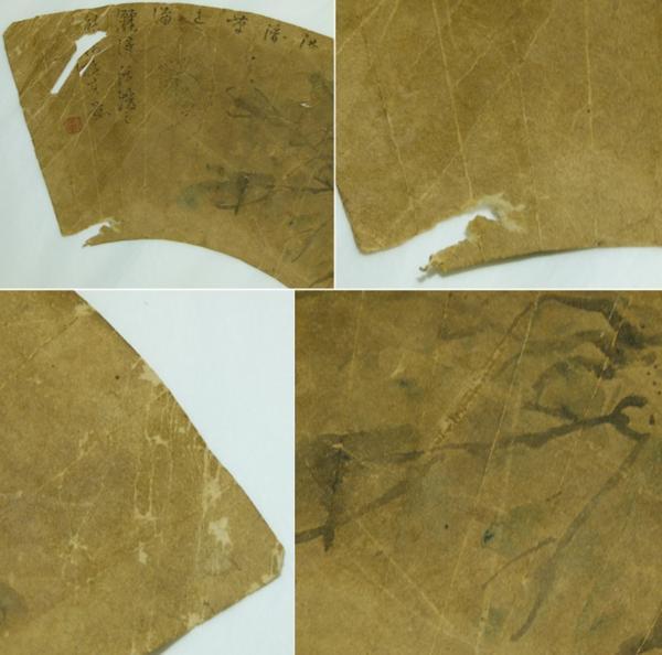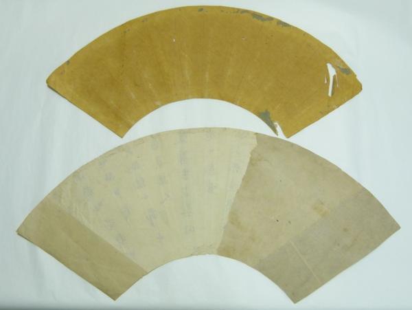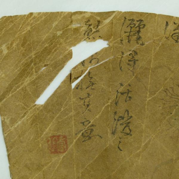 素材:和紙。写真3枚目:上辺横44cm×下辺横23cm×縦幅約14cm。写真8枚目:上辺横51.5cm×下辺横23.5cm×縦幅約16.5cm。折れ皺や破れ、焼けシミや傷みなどあります。