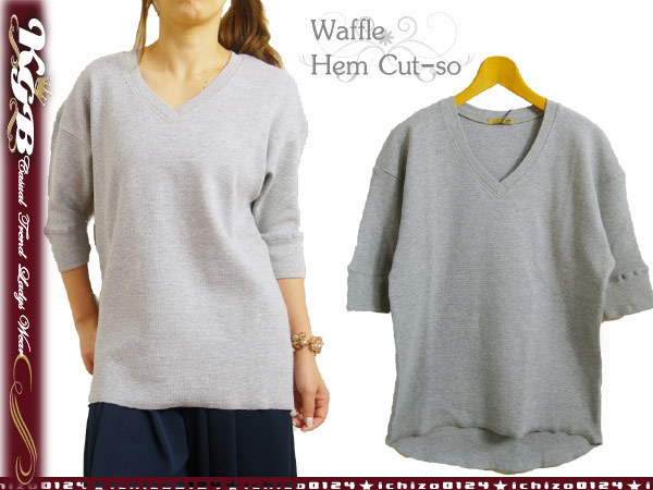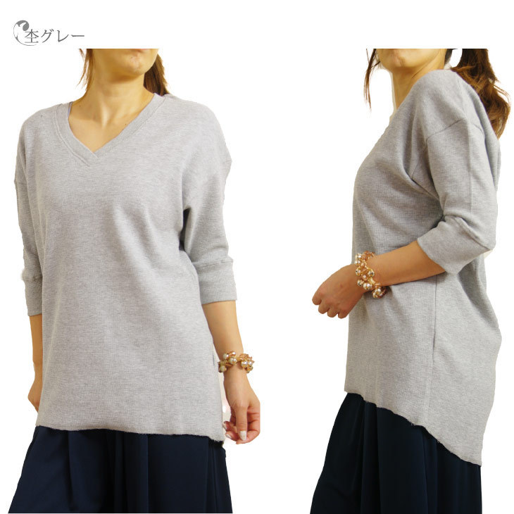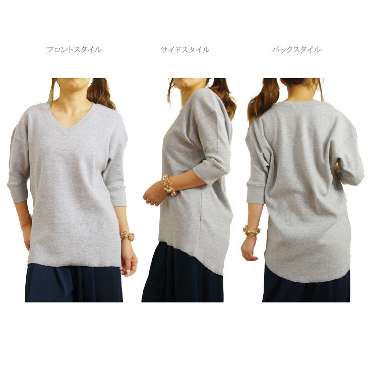 LL~3L 杢グレー カットソー 6分袖 レディース Vネック ワッフル Tシャツ 新品