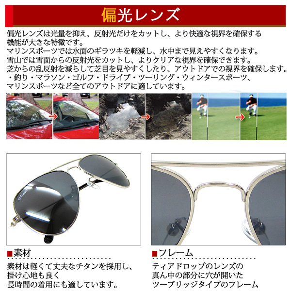 | 長年に渡り絶大な支持を受けている『ティアドロップサングラス』 ティアドロップのレンズの真ん中の部分に穴が開いたツーブリッジタイプのレアフレームです。 素材は軽くて丈夫なチタンを採用し、掛け心地も良く長時間の着用にも適しています。 どんなファッションにも合わせやすくユニセックスでお使い頂けるアイテムです。 オシャレを楽しむだけでなく、紫外線を99%カットしてくれるので、お出かけの際の紫外線対策としてもオススメです。 一切妥協せずファッション性、実用性を重視し、選び抜かれた素材でしあがったMaturiサングラスを是非体験して頂きたい。 【偏光レンズとは】 眩しさや反射光を、より効果的にカットできるレンズです。 偏光レンズは光量を抑え、反射光だけをカットし、より快適な視界を確保する機能が大きな特徴です。 マリンスポーツでは水面のギラツキを軽減し、水中まで見えやすくなります。 マラソン・釣り・ゴルフ・ツーリング・ウィンタースポーツなどに適しています。 ■カラー:レンズ/グレーミラー、テンプル/シルバー ■サイズ:(約)レンズ横5.6cm×縦4.8cm、フレーム幅(外側)13.7cm (実寸につき誤差はあらかじめご了承ください) ■素材:レンズ(紫外線UVカット約99%)、フレーム/チタン ■可視光線透過率:10% ■紫外線透過率:1.0%以下 ■付属品:専用ケース ■新品・未使用 ■定価27,800円 ※一部画像共通 ※ご覧のモニターやプラウザの設定、照明等により、画像と実物の色合いが、若干異なる場合が御座います。 ※製造上の過程により商品によっては細かな傷がある場合が御座います予めご了承下さいませ。 | |