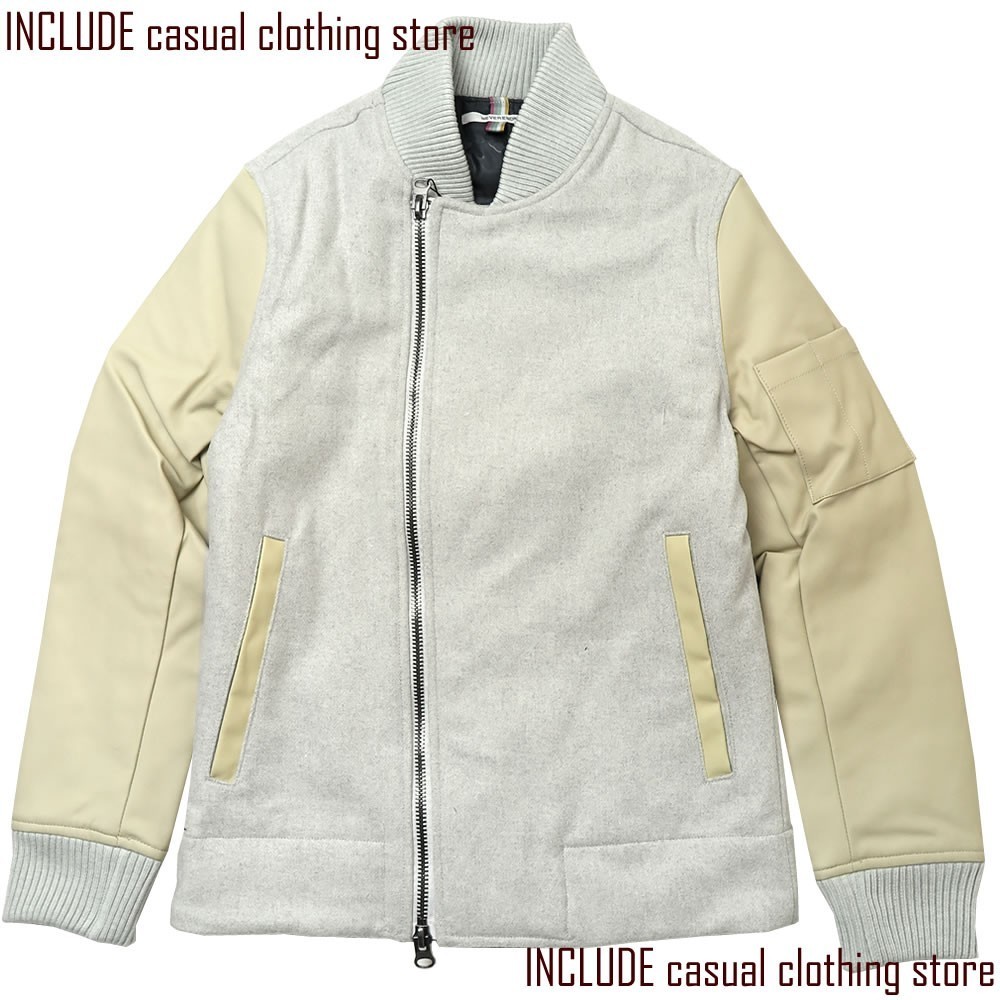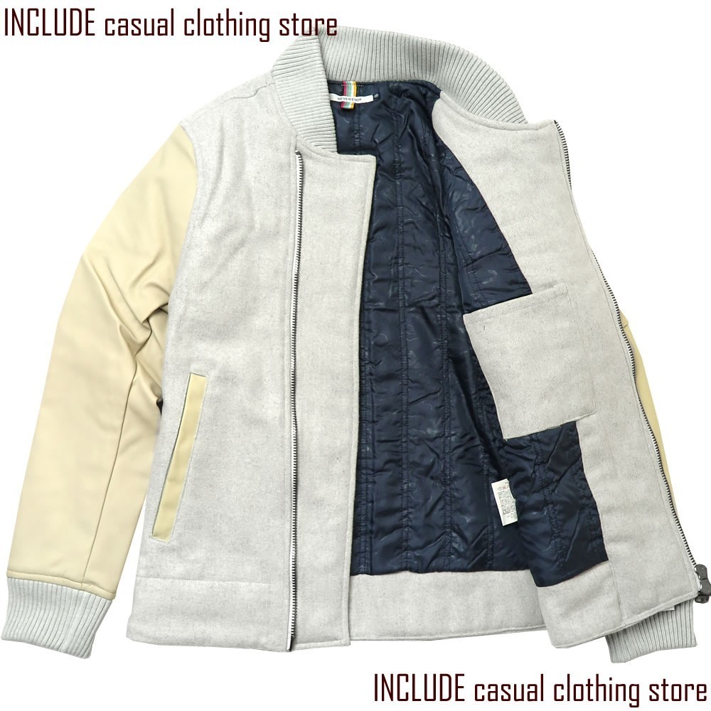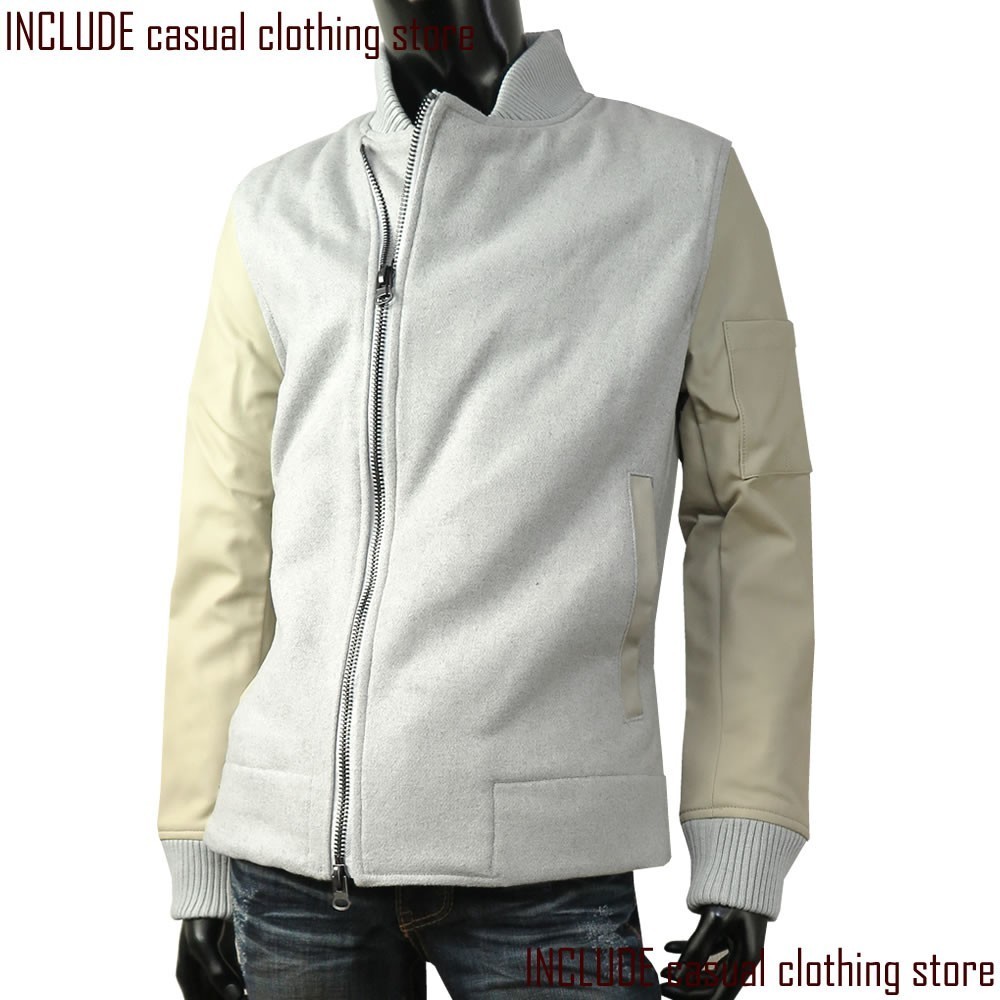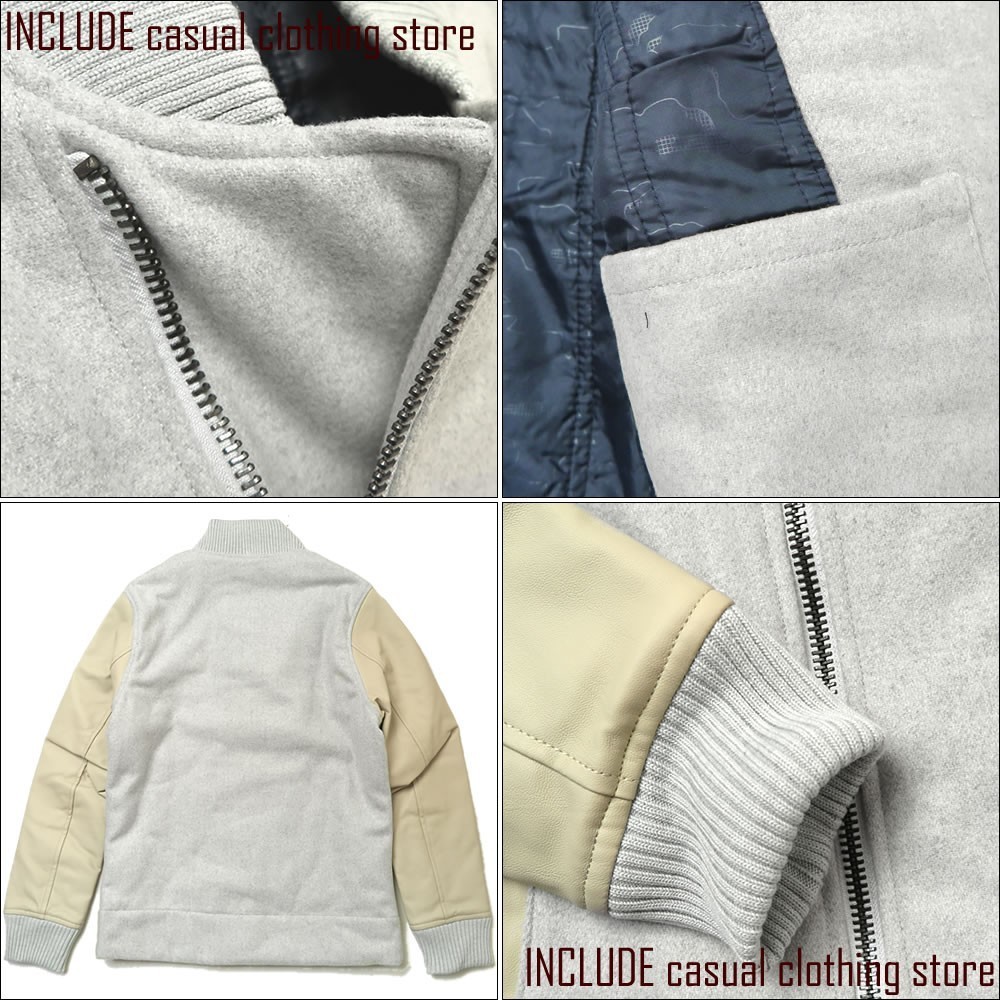 滑らかな風合いのメルトン素材に、袖は合成皮革を使用した、モダンで個性的なデザインのジャケットです。