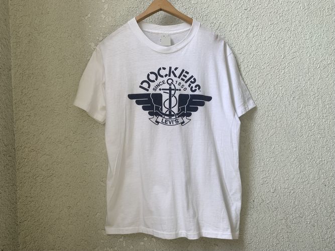 USA製~90sビンテージLevi'sリーバイスDOCKERSドッカーズプリントオールコットンTシャツ他社タグL白アメカジストリートアメリカ製nr117