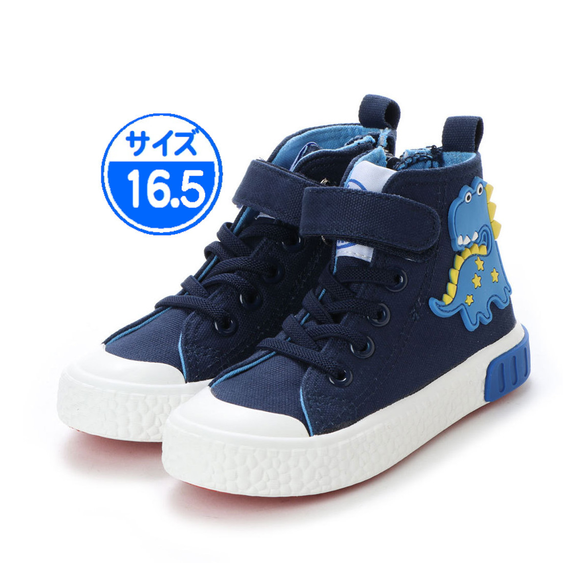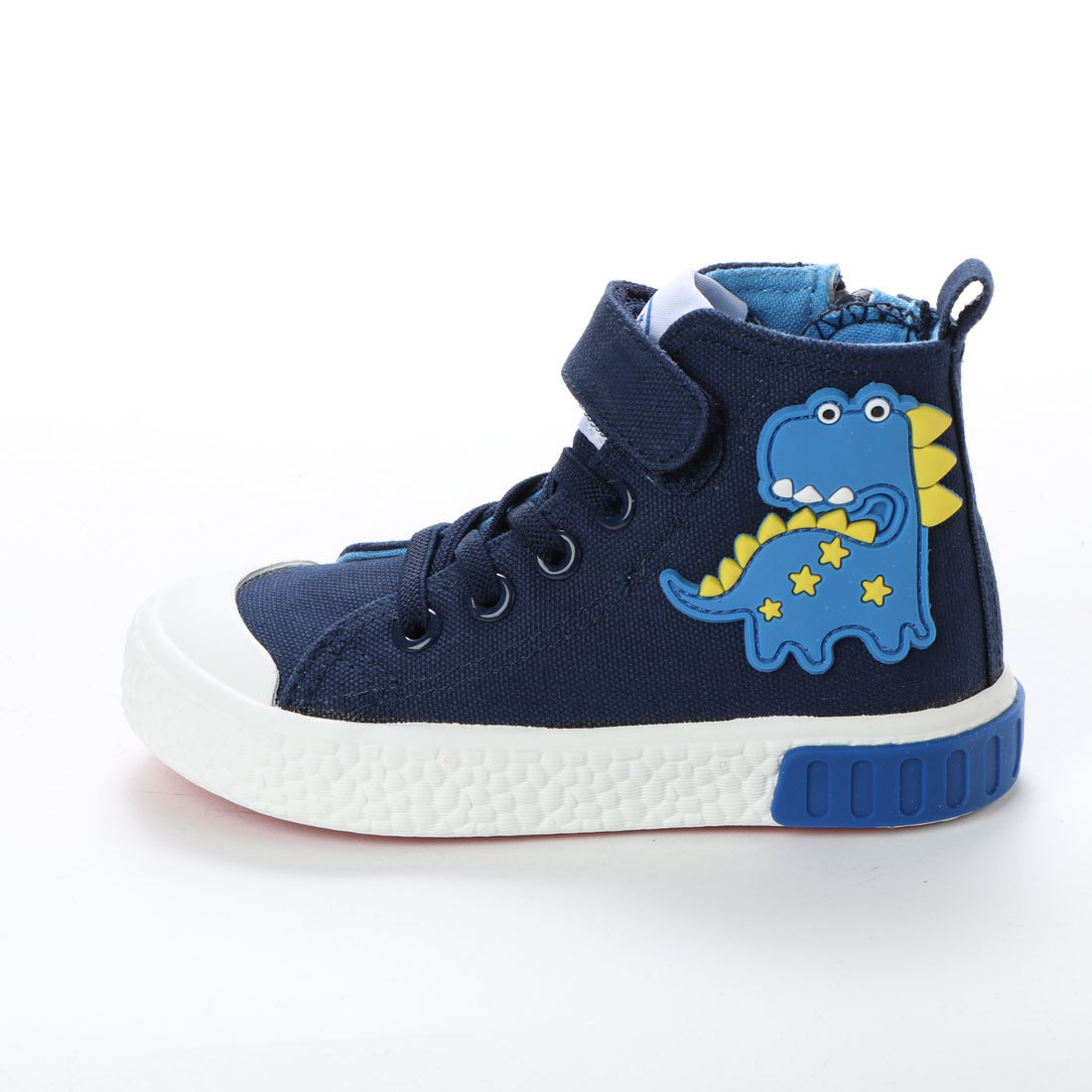 恐竜のキャラクターが可愛い、子供用のハイカットスニーカー。