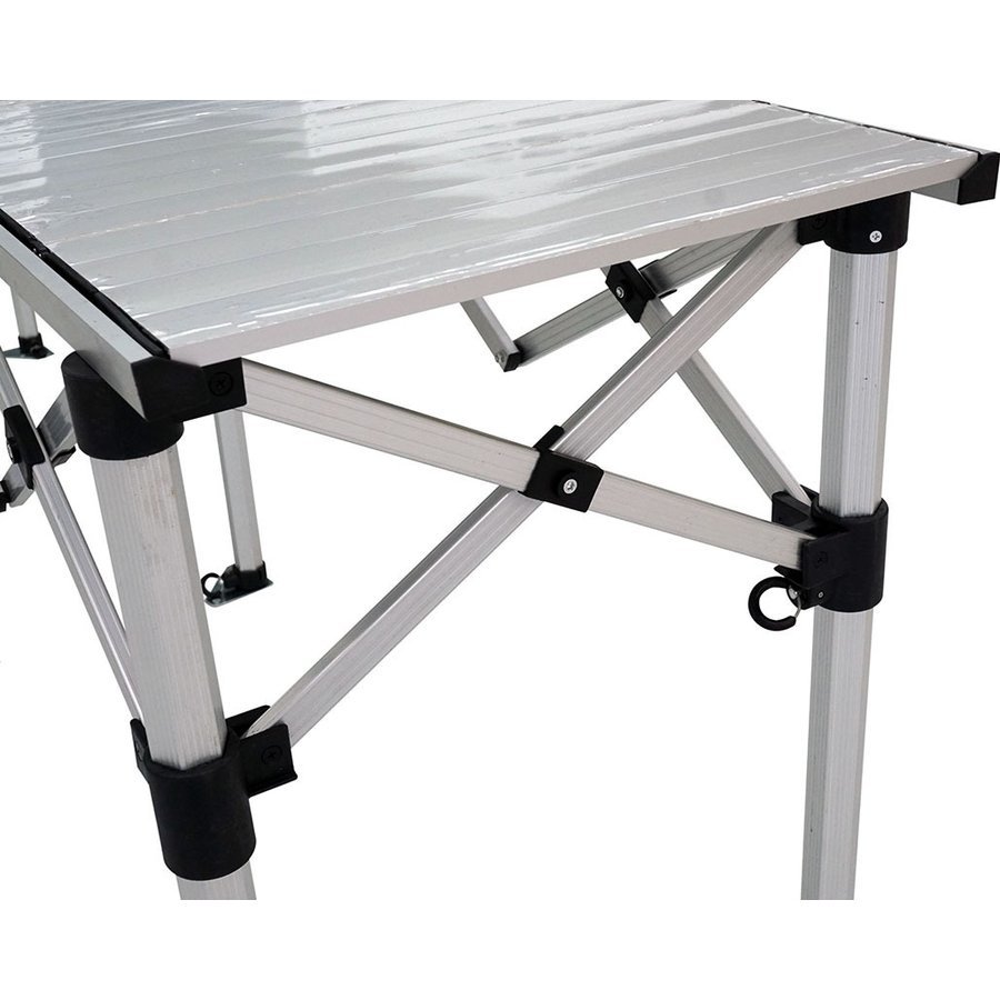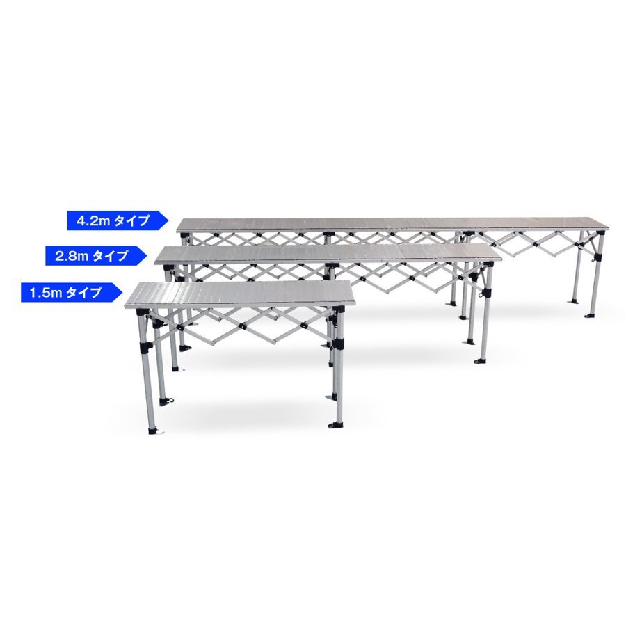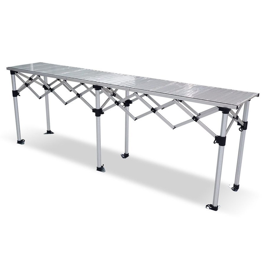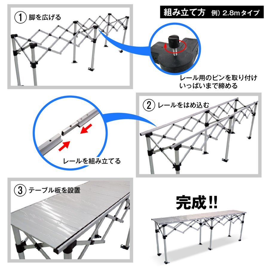 折りたたみ アルミフォールディングテーブル ミドルタイプ サイズ : (約)幅2850mm×奥行530mm×高さ940/1000/1060mm 重量 : 約29.0kg(脚15.4kg/テーブル板13.6kg) 素材 : アルミ(一部樹脂) 付属品 : 収納ケース(脚、テーブル板) 脚は太さ40mmの六角柱ですので非常に丈夫です。 イベントの受け付けや展示台として、また多人数でのレジャー、キャンプなどにいかがでしょうか。 折りたたみ式ですので移動にも困りません。 組み立ては、脚を広げてレールを取り付け、その上にテーブル板を乗せるだけですので2人いれば短時間で簡単に設置できます! ※海外製品のためアルミ表面などに細かなキズがある場合があります。予めご了承ください。 管理番号 AFT2850 | ||