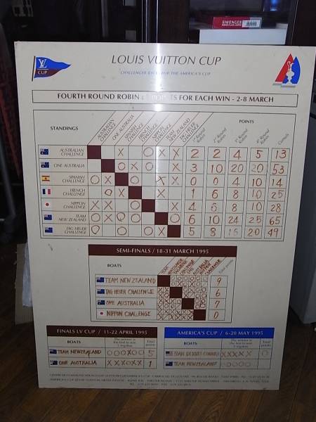 世界的に有名なヨットレース・アメリカズカップの前哨戦であるルイヴィトンカップで実際に使用された成績ボードです。大きさは約60×80センチ、厚さ約5ミリの樹脂性のボードです。実際のレースを観戦に行った時に