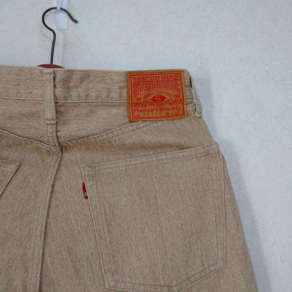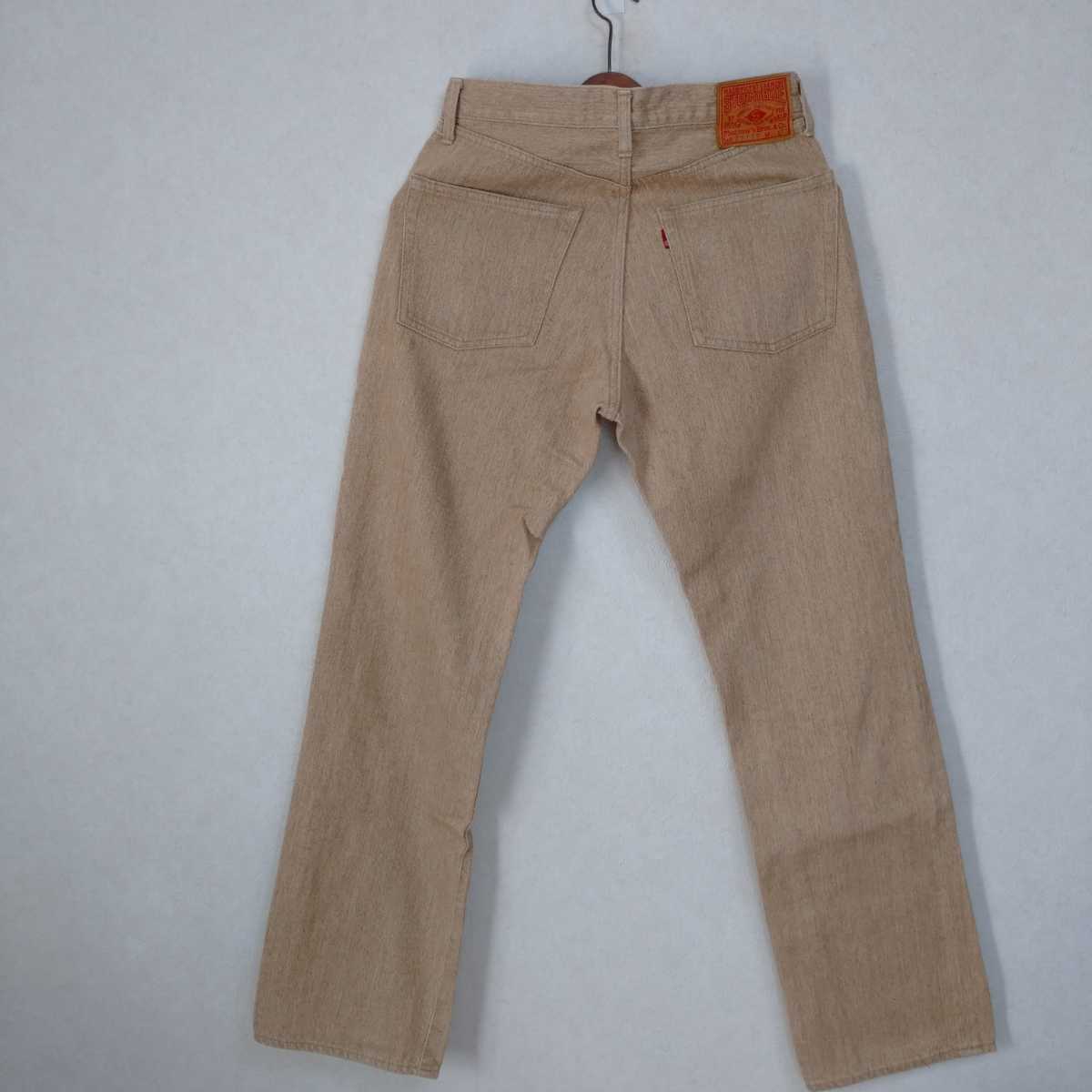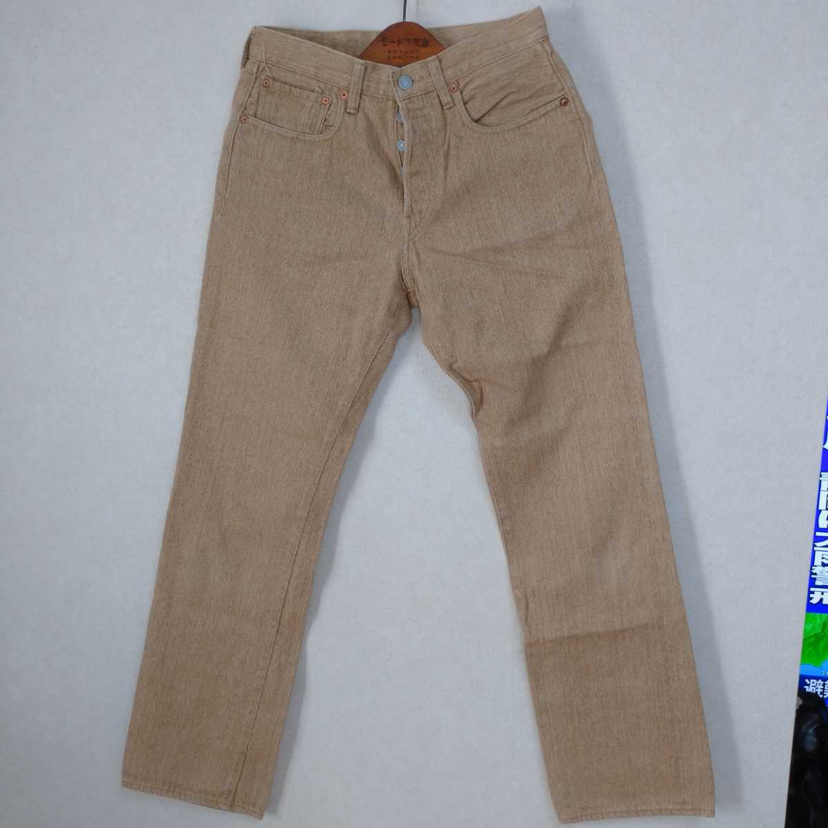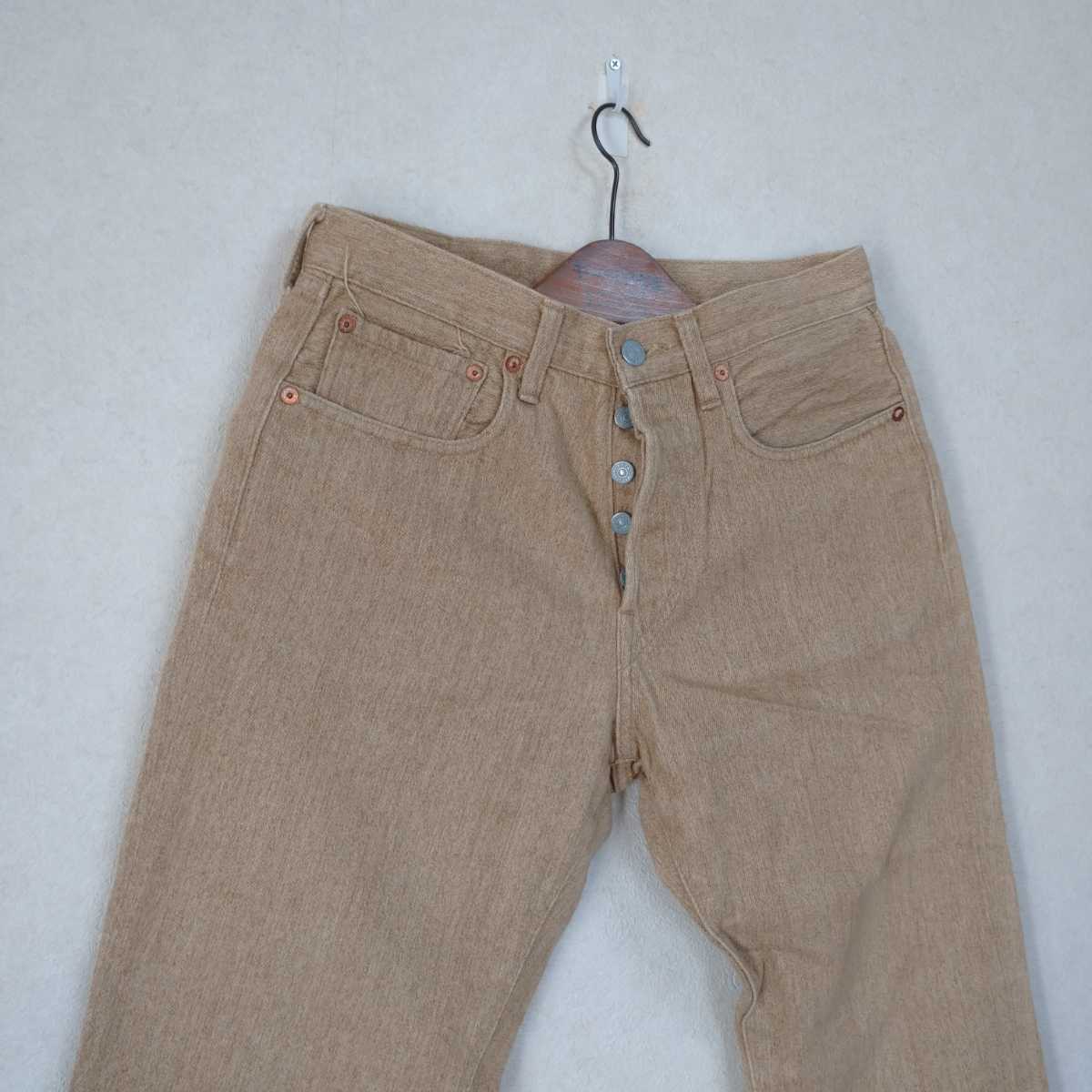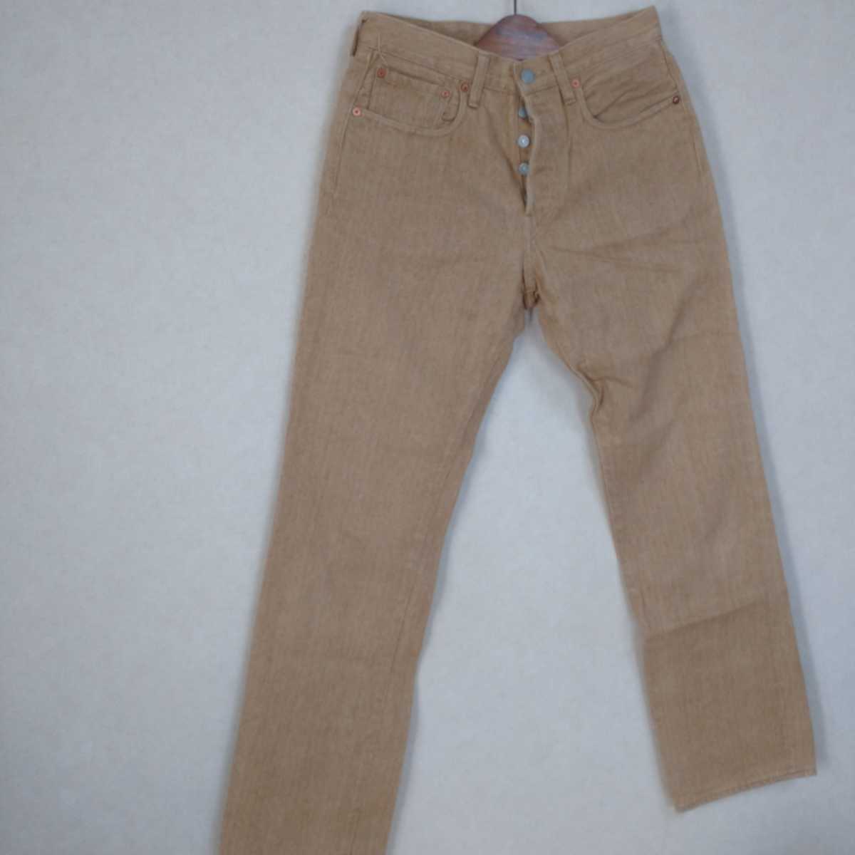 サイズ実寸約W70(平置×2)L79(股下縫目〜裾先端)総丈105(サイド縫目に沿って)多少の誤差はお許しください。きれいで良い雰囲気です。日本製? 薄茶のストレートジーンズ、501タイプ。できる限りダメージは説明させていただきますが、こちらが気づかない程度のわずかなしみ、よごれ、