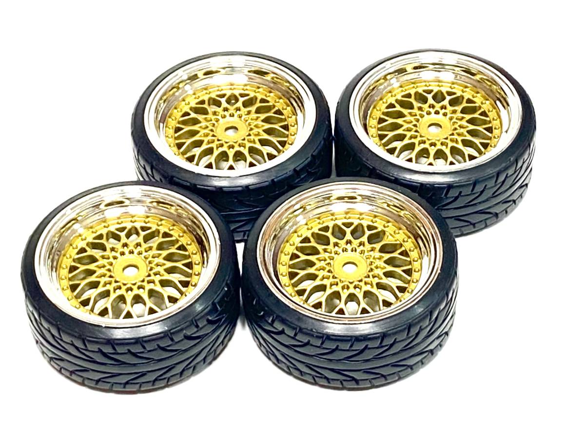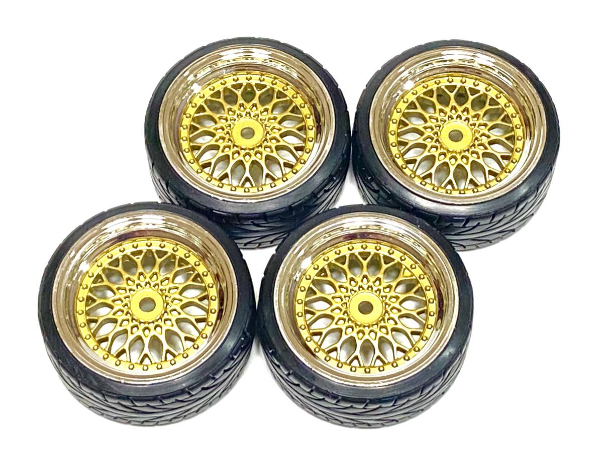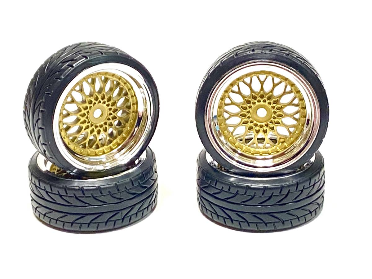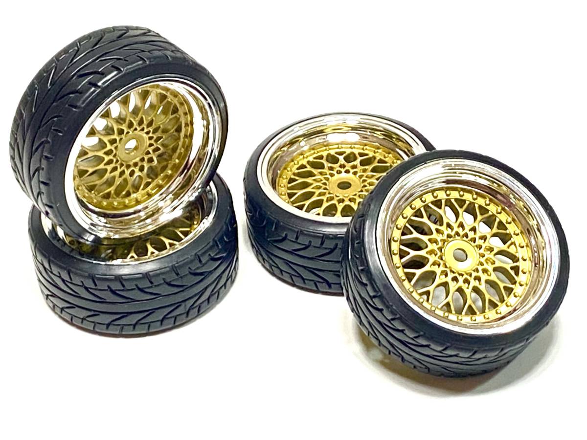 1/10 旧車ドリフトカー用 ハードパターンタイヤ組込み済み RS風ゴールドメッシュホイール4本 セットです。
