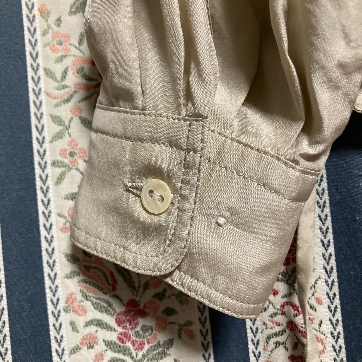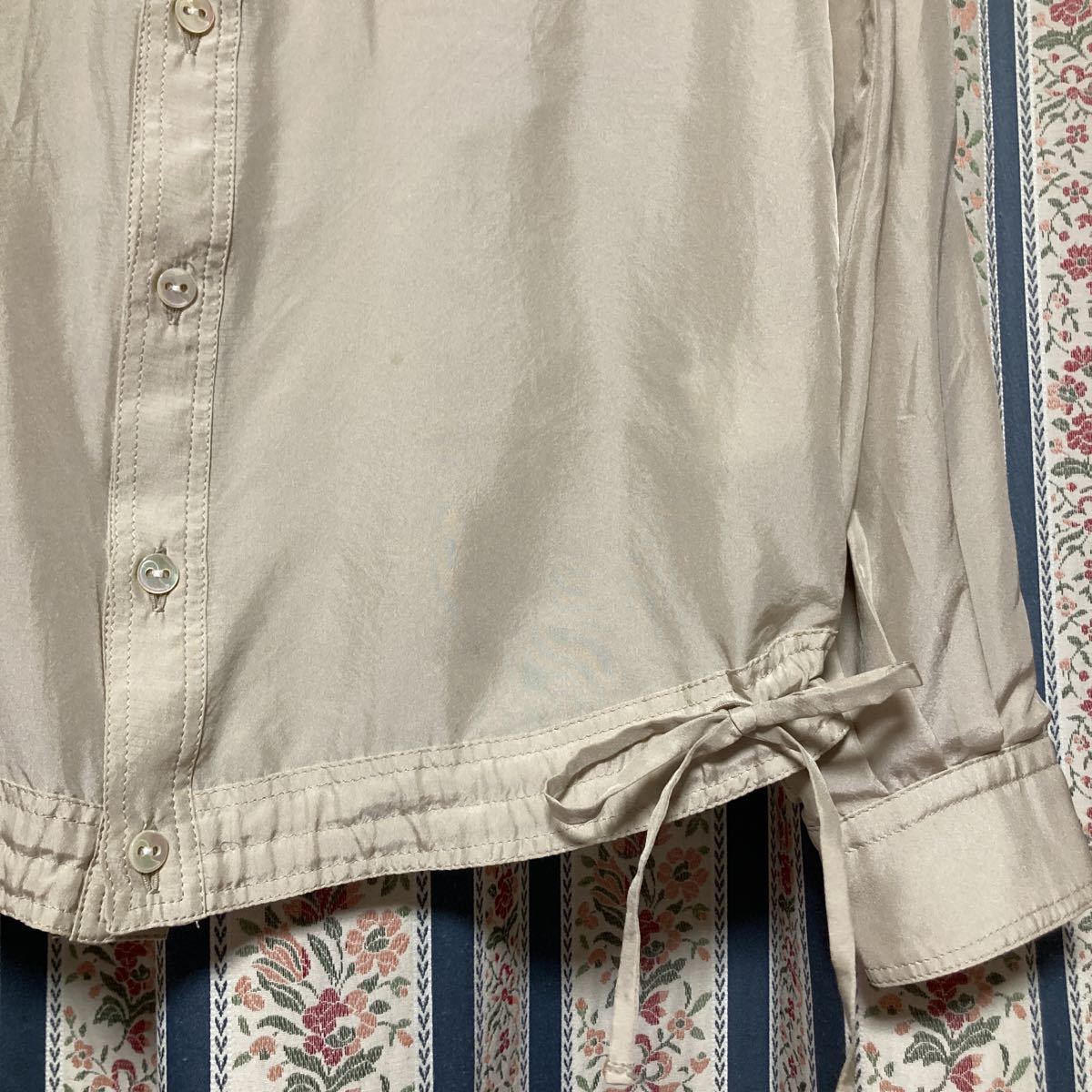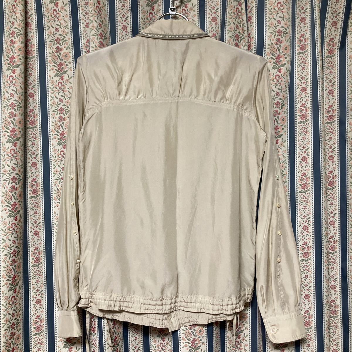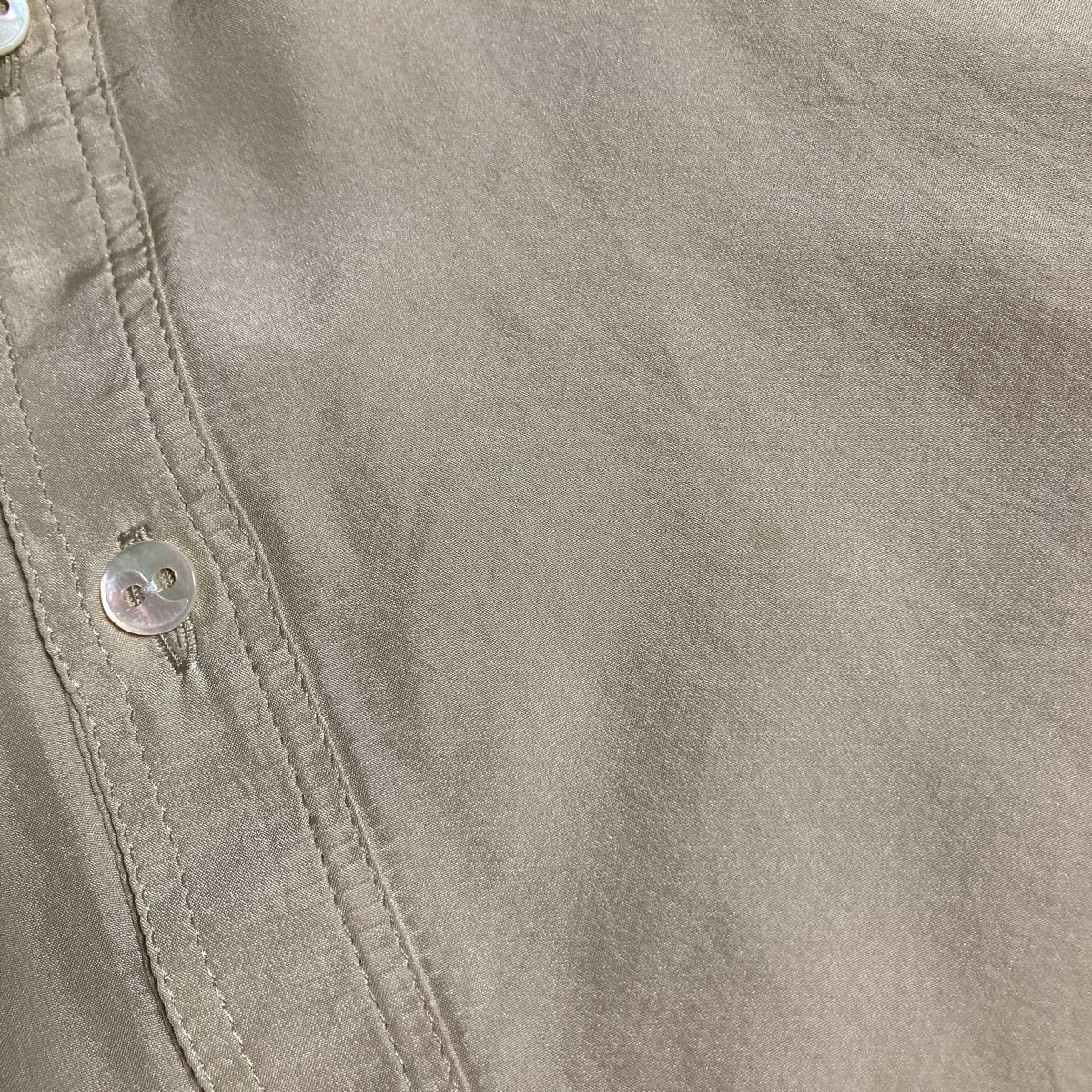5回程度の着用で、左お腹の辺りにうっすら小シミあり。袖口の2個ついたボタンのうち、左のひとつが欠損しています。
