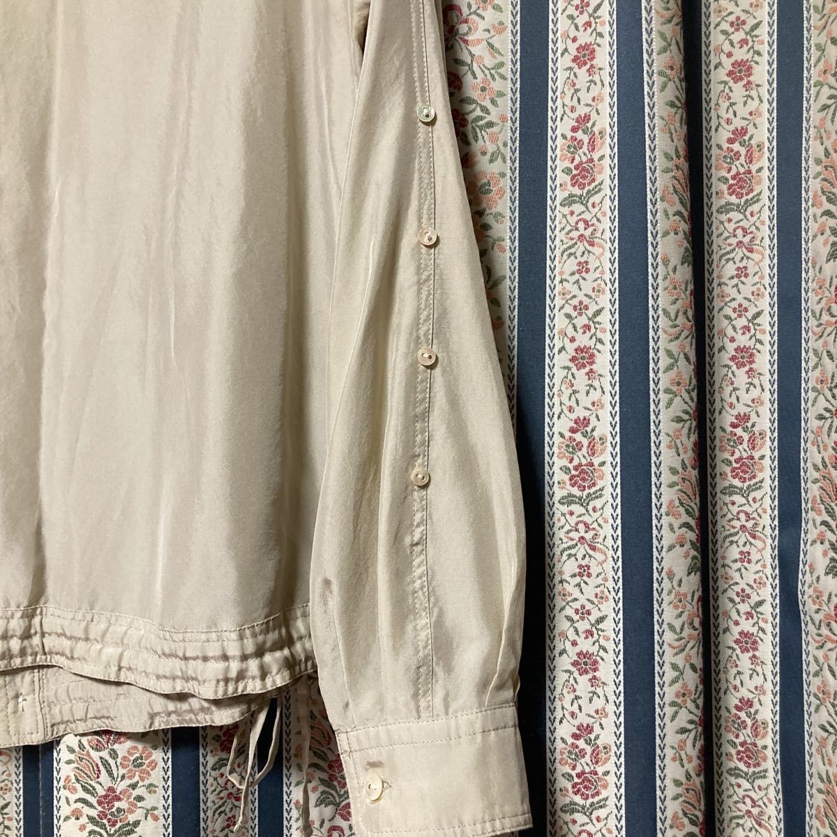 袖には小さなボタンが並んでおり、袖の内側のループを引っ掛けられるようになっています。裾は絞れるようになっていて、背中にはギャザーがあしらわれた凝ったデザイン。色はベージュ。タイト目のレギュラーフィット。